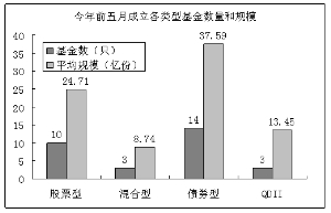 今年以来,新成立的基金呈现逐月增加态势,一到五月份各有1只、1只、7只、8只和13只新基金成立。从基金类型上看,债券型基金数量达到14只,占比将近一半,股票型基金达到10只,占三分之一,混合型基金和QDII基金各有3只。由于今年以来股市持续下跌,债券型基金受到投资者的更多关注,平均成立规模达到37.59亿份,超过了股票型基金24.71亿份的平均规模,QDII和混合型基金平均规模分别为13.45亿份和8.74亿份,总体来看,规模小于10亿份的“迷你”基金达到10只,在目前新基金发行十分困难的时刻,今年业绩抗跌的基金公司发行的新基金销售情况较好,如东吴行业、兴业社会、嘉实精选和上投双核等首募规模均超过10亿元。虽然目前新成立基金及在发基金数量众多,但由于偏股型基金募资规模过小,使得市场期待的新基金建仓效应大打折扣,新基金的建仓行为难以推动股市上涨,并且,目前老偏股基金仓位较轻,使得新基金建仓也非常谨慎。基金买涨行情难现,借助新基金维护市场稳定的救市政策难以奏效。(朱景锋)
