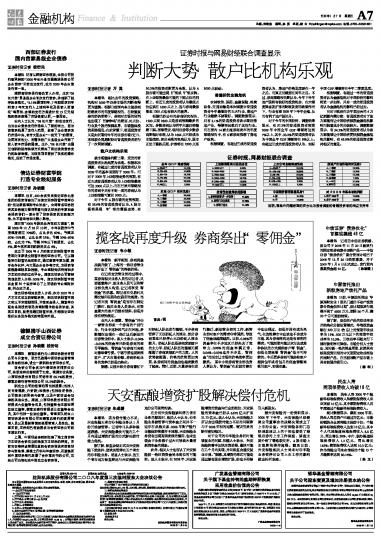 据悉,目前大部分券商都忙于对经纪人队伍进行整顿,不少券商暂停了无证经纪人的展业,部分券商甚至已经停止无证经纪人展业数月。经纪人队伍是券商发掘客户的主力军,经纪人队伍的整顿无疑削弱了券商发掘客户的力度。人的优势被削弱,价格的优势更加突显,各券商间的佣金战也越发激烈了起来。同时,近期,大量券商在进行搬迁、新设营业部的工作,新营业部对客户的需求非常强烈,导致了佣金战越演越烈。目前,0.08%的佣金率在不少地区已经失去了竞争力,0.06%的佣金率属正常,0.04%~0.03%也并不少见,“零佣金”的面市让市场的价格竞争更加激烈。 某中小型券商营业部负责人则认为,“零佣金”在此前的熊市中也出现过,但是并没有成为风气,在这轮熊市中应该也不会成为主流,因为券商终究还是有盈利的需求。可能短期内能以双方达成某种协议的方式提供客户零“佣金”,但是长期来看“零佣金”是不可持续的。今后更多券商可能会给客户提供包年或者包月的佣金套餐来吸引客户,实现双赢。