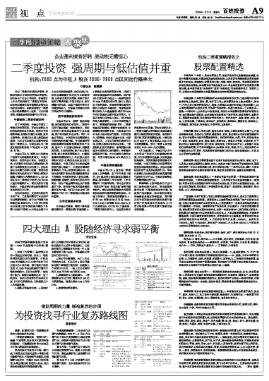 中信证券:二季度市场周期性行业价格空间和复苏次序:(1)供给需求价格弹性看价格上涨空间,原油、铜、铁矿石之类上游资源品价格上涨空间最大,房地产、汽车之类大宗消费商品次之,钢铁、水泥等工业原材料价格上涨空间最小;(2)从库存周期看行业复苏次序,可能是“可选消费—能源大宗商品—工业制成品—基建—中间材料”;(3)未来出口快速恢复,相关行业和股票将获得较好的表现机会,如交通运输中的航运;(4)流动性充裕的情况下看好证券、保险和银行。超配行业:周期股和金融股,但内涵和次序有所变化。看好房地产、金融、钢铁、航运、航空,以及新能源。个股组合:保利地产、武钢股份、晨鸣纸业、铜陵有色、潍柴动力、中海集运、南方航空、吉林敖东、中国平安、北京银行。