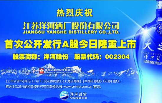 热烈庆祝江苏洋河酒厂股份有限公司 首次公开发行A股今日隆重上市