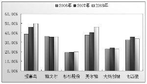 ★ 盈利能力突出。2006-2008年综合毛利率呈现逐年稳步增长态势,且在同行业可比上市公司中连续三年排名第一,公司综合毛利率与同行业可比上市公司综合毛利率平均值的差额从10个百分点稳步扩大到18个百分点。在市场竞争进一步升级的环境下,公司在销售规模持续、快速扩大的同时,还能够保持毛利率水平持续增长,显示出公司对于品牌价值的良好维护和提升,以及较高的整体营销能力,也证明公司这两年开拓直营模式及提高直营网点比例的战略举措初显成效。