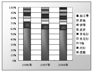 公司的销售主要面向国内市场,内销占比在90%左右。西服目前是公司的主要收入来源,2004~2008年西服上衣和西裤销售收入占主营业务收入的比重稳定在50%左右,非西服类产品的销售占主营业务收入的比重保持50%左右。