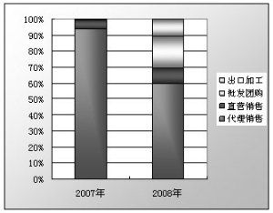 从销售模式的构成来看,代理销售模式的收入占比仍较高,2008年接近60%,但该数据比2007年的93.93%有了大幅下降。随着近两年公司直营体系不断完善,直营销售占主营业务收入的比例由2007年的5.32%提升到2008年的10.04%。2008年4月报喜鸟将宝鸟公司置入麾下,宝鸟给公司带来了批发团购和网络直销新型业务模式。从上述过去两年数据中我们可以看出公司的销售模式在不断优化,已成功从以特许加盟为主的经营模式提升为“直营—加盟并存”的复合模式。