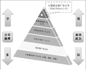 大型综合性广告公司(国际和国内4A广告公司)处于金字塔的顶端。这些公司可以从企业战略规划到广告活动实施各个环节为广告主提供全面服务,“整合营销传播”是其优势所在。目前,我国的大型综合性广告公司主要是以国内4A公司和跨国广告公司在我国独资或合资经营的广告公司为主。