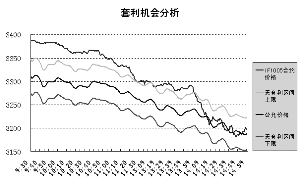 套利机会分析。昨日沪深300股指期货主力IF1005合约价格很多时候都落在无套利区间之内,也就是说,考虑到交易成本,IF1005合约的期现套利机会主要在上午9:40-10:00以及下午14:05-15:00交易时段。