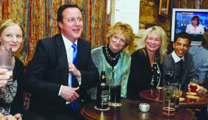 据英国媒体7日公布的大选最新计票结果显示,主要政党无一赢得多数议席,从而出现1974年以来首个“无多数议会”,保守党成为英国议会下院的最大政党。图为保守党领导人卡梅伦在惠特尼与支持者庆祝。