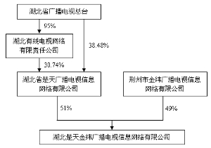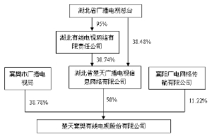楚天襄樊系经襄樊市人民政府以襄樊政函【2010】12号《市人民政府关于同意湖北省楚天广播电视信息网络有限责任公司、襄樊市广播电视局、襄阳广电网络传输有限公司合资合作合同书》批准,由楚天网络、襄樊市广播电视局以及襄阳广电网络传输有限公司共同发起设立的股份有限公司,其中,楚天网络13,000万元实物资产出资;襄樊市广播电视局以10,084万元现金出资,襄阳广电网络传输有限公司2,916万元实物资产出资。首次出资后,楚天襄樊股权结构图如下: