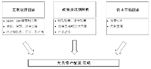 在实施大类资产配置时,主要考察三方面的因素:宏观经济因素、政策及法规因素和资本市场因素。见下图: