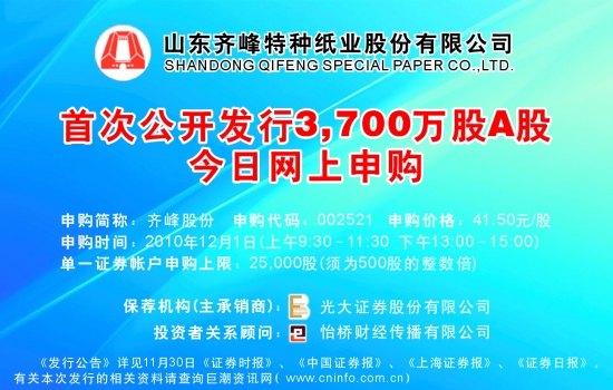 山东齐峰特种纸业股份有限公司 首次公开发行3,700万股A股 今日网上申购