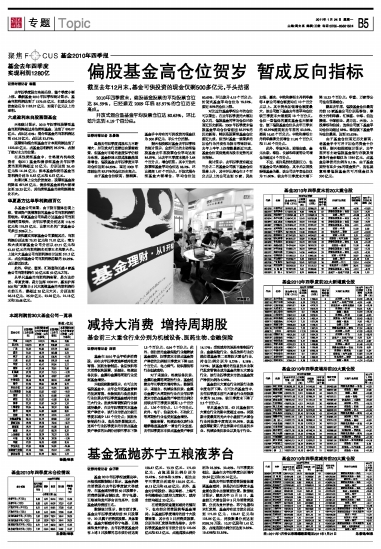 证券时报记者 杨磊 去年四季度股市先扬后抑,整个季度小幅上涨。最新基金2010年四季报统计显示,基金当期利润达到了1279.53亿元,扣减公允价值变动后为1182.37亿元,实现千亿元以上的盈利。 六成盈利来自股票型基金 天相统计显示,2010年四季报股票型基金当期利润超过其他类型基金,达到了806.07亿元,占比达63%;混合型基金的当期利润达到416.75亿元,占比达32.57%。 股票型和混合型基金合计本期利润达到了1222.82亿元,占基金总利润的95.57%,占据了绝对主力的位置。 在其他类型基金中,合格境内机构投资者(QDII)基金和债券型基金去年四季度当期利润超过10亿元,分别达到26.43亿元和14.94亿元;保本基金和货币基金当期利润分别为8.82亿元和6.52亿元。 如果计算上公允价值变动,股票型基金盈利降至697.95亿元,债券型基金盈利大幅增加至29.23亿元,其他类型基金的盈利规模变化不大。 华夏易方达单季利润超百亿 从基金公司来看,由于股市整体出现上涨,管理资产规模靠前的基金公司当期利润明显领先。华夏基金公司和易方达基金公司当期利润明显领先,去年四季度分别达到118.75亿元和118.53亿元,比第三名的广发基金公司多出50%以上。 广发和嘉实两家基金公司紧随其后,当期利润分别达到73.32亿元和71.01亿元;南方和大成两家基金公司分别以67.71亿元和61.87亿元的当期利润名列第五名和第六名。上述六大基金公司当期利润合计达到511.2亿元,占全部基金公司当期利润总额的39.95%,占比接近四成。 此外,华安、富国、汇添富和长盛4家基金公司当期利润在30亿元至52亿元之间。 从单只基金的当期利润来看,易方达价值、华夏优增、易方达深100ETF、嘉实沪深300和广发聚丰5只大规模基金的当期利润排在前五名,都超过20亿元大关,分别达到26.18亿元、25.59亿元、23.28亿元、21.18亿元和20.68亿元。 本期利润前30大基金公司一览表 单位:亿元 基金公司 本期利润[去年四季报] 本期利润扣减公允价值变动后净额[去年四季报] 本期利润[去年三季报] 本期利润扣减公允价值变动后净额[去年三季报] 华夏 118.75 112.74 296.44 5.86 易方达 118.53 85.75 238.69 -5.11 广发 73.32 51.83 172.75 6.01 嘉实 71.01 48.75 163.88 3.23 南方 67.71 43.20 136.91 -17.75 大成 61.87 66.86 159.35 4.46 华安 51.75 45.47 95.04 3.17 富国 41.87 32.46 70.61 2.68 汇添富 32.70 32.37 71.13 -1.78 长盛 32.64 16.19 49.87 -0.22 中邮创业 30.46 28.10 60.16 -10.05 银华 27.50 29.04 101.99 0.75 兴业全球 27.39 22.37 54.94 0.93 光大保德信 24.80 12.07 45.87 -9.52 诺安 22.77 18.71 61.88 -3.56 建信 22.51 15.07 41.00 0.16 国泰 22.35 15.67 64.39 1.35 工银瑞信 22.04 24.46 59.32 0.86 鹏华 20.95 14.85 66.80 0.81 招商 20.71 19.75 42.24 -3.45 交银施罗德 20.14 34.75 69.80 -7.32 景顺长城 19.58 39.70 70.46 -8.72 海富通 19.25 19.65 54.08 0.46 融通 19.14 12.07 80.78 0.32 上投摩根 18.55 30.79 70.32 1.20 中银 18.38 21.96 39.26 -1.56 华商 17.81 16.53 40.80 8.16 华宝兴业 17.63 18.06 54.01 -24.64 国海富兰克林 17.16 9.04 23.12 -3.93 泰达宏利 16.73 21.55 38.34 1.72 杨磊/制表 基金2010年四季度末仓位情况 统计范围 2010年四季度 银行存款及清算备付金 债券 股票 重仓股 持股集中度(%) 占净值比例(%) 全部平均(不可比) 8.10 6.92 84.46 37.13 43.96 全部平均(可比) 8.00 6.92 84.59 37.19 43.97 开放式平均(不可比) 8.22 6.42 84.82 37.00 43.62 开放式平均(可比) 8.12 6.41 84.96 37.06 43.62 封闭式基金平均(不可比) 5.95 15.59 78.32 39.42 50.33 封闭式基金平均(可比) 5.95 15.59 78.32 39.42 50.33 股票型开放式平均(可比) 8.74 2.49 88.20 38.75 43.93 混合型开放式平均(可比) 7.29 11.64 80.63 34.81 43.17 朱景锋/制表 本版导读: