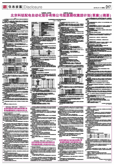 4、考核申诉 如被考核对象对考核结果或考核等级有异议,可在考核结果反馈表发放之日起5个工作日内向薪酬与考核委员会工作小组提出申诉,工作小组可根据实际情况对其考核结果进行复核,如确存在不合理,可向薪酬与考核委员会提出异议,由薪酬与考核委员会确定最终考核结果或等级。 5、对激励对象实施廉政建设一票否决制,即激励对象在此期间出现违背内部审计制度的行为,董事会将视情节给予取消当期乃至全部股票期权行权资格的处理。 五、考核结果反馈及应用 1、考核结果反馈 每次考核结束后,由薪酬与考核委员会工作小组统一制作反馈表一式二份,一份薪酬与考核委员会备案,另一份反馈至被考核对象。考核结束后,考核结果作为保密资料档案保存。 2、考核结果作为股票期权授予和行权依据。 (1)激励对象上一年度考核合格后才具备获授权益本年度的行权资格。 (2)考核结果为不合格的员工,公司将激励计划的有关规定,其相对应行权期所获授的可行权股票期权数量作废,由公司注销。 六、附则 1、本办法由董事会负责制订、解释及修订。 2、本办法自股东大会审议通过之日起开始实施。 北京科锐配电自动化股份有限公司董事会 二〇一一年三月十日 本版导读: