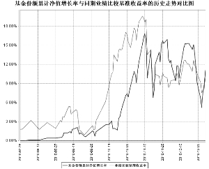 (二)基金合同生效以来基金份额净值的变动情况,并与同期业绩比较基准的变动的比较 ■ 注:1、本基金基金合同于2010年7月28日生效,2010年9月1日开始办理申购、赎回业务。 2、本基金的投资组合比例为:权益类资产占基金资产的60%-95%,固定收益类资产占基金资产的5%-40%,基金保留的现金或者投资于到期日在一年以内的政府债券的比例合计不低于基金资产净值的5%,投资于红利股票的资产比例不低于股票资产的80%。 十三、基金的费用与税收 (一)基金费用的种类 1.基金管理人的管理费; 2.基金托管人的托管费; 3.基金财产拨划支付的银行费用; 4.基金合同生效后的基金信息披露费用; 5.基金份额持有人大会费用; 6.基金合同生效后与基金有关的会计师费和律师费; 7.基金的证券交易费用; 8.在中国证监会规定允许的前提下,本基金可以从基金财产中计提销售服务费,具体计提方法、计提标准在招募说明书或相关公告中载明 9.依法可以在基金财产中列支的其他费用。 (二)上述基金费用由基金管理人在法律规定的范围内参照公允的市场价格确定,法律法规另有规定时从其规定。 (三)基金费用计提方法、计提标准和支付方式 1、 基金管理人的管理费 在通常情况下,基金管理费按前一日基金资产净值的1.5%年费率计提。计算方法如下: H=E×年管理费率÷当年天数 H为每日应计提的基金管理费 E为前一日基金资产净值 基金管理费每日计提,按月支付。由基金管理人向基金托管人发送基金管理费划付指令,经基金托管人复核后于次月首日起3个工作日内从基金财产中一次性支付给基金管理人,若遇法定节假日、休息日,支付日期顺延。 2、 基金托管人的托管费 在通常情况下,基金托管费按前一日基金资产净值的0.25%年费率计提。计算方法如下: H=E×年托管费率÷当年天数 H为每日应计提的基金托管费 E为前一日基金资产净值 基金托管费每日计提,按月支付。由基金管理人向基金托管人发送基金托管费划付指令,经基金托管人复核后于次月首日起3个工作日内从基金财产中一次性支付给基金托管人,若遇法定节假日、休息日,支付日期顺延。 3、 基金申购(基金合同生效后购买本基金) 投资者在申购基金份额时需交纳前端申购费,费率按申购金额递减,具体费率如下: