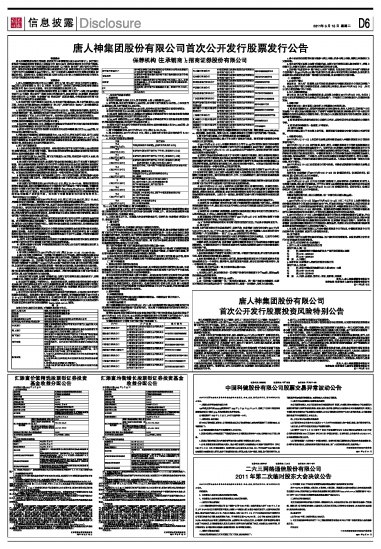 保荐机构(主承销商):招商证券股份有限公司 特别提示 唐人神集团股份有限公司根据《证券发行与承销管理办法》(2010年修订)、《关于深化新股发行体制改革的指导意见》(证监会公告[2010]26号)的相关规定首次公开发行股票。本次初步询价及网下发行均采用深圳证券交易所(以下简称“深交所”)网下发行电子平台进行。请询价对象及其管理的配售对象认真阅读本公告及《深圳市场首次公开发行股票网下发行电子化实施细则》(2009年修订)。请广大投资者认真阅读本公告及同日刊登在《中国证券报》、《证券时报》、《上海证券报》及《证券日报》上的《唐人神集团股份有限公司首次公开发行股票投资风险特别公告》。 重要提示 1、唐人神集团股份有限公司(以下简称“发行人”或“唐人神”)首次公开发行不超过3,500万股人民币普通股(A 股)(以下简称“本次发行”)的申请已获中国证券监督管理委员会证监许可[2011]331号文核准。本次发行的股票拟在深交所上市。 2、本次发行采用网下向配售对象询价配售(以下简称“网下发行”)与网上资金申购定价发行(以下简称“网上发行”)相结合的方式同时进行,由保荐机构(主承销商)招商证券股份有限公司(以下简称“主承销商”或“招商证券”)组织承销团,分别通过深交所网下发行电子平台和深交所交易系统实施。 3、本次发行网下发行数量为700万股,为本次发行数量的20%;网上发行数量为2,800万股,为本次发行数量的80%;申购简称为“唐人神”,申购代码为“002567”,该申购简称及申购代码同时用于本次发行网上网下申购。 4、本次发行的初步询价工作已于2011年3月11日完成。根据初步询价情况,经发行人与主承销商协商一致,最终确定本次发行的发行价格为27.00元/股。本次发行价格所对应的发行市盈率超过了可比上市公司平均水平。此价格对应的市盈率及有效报价情况为: (1)50.00倍(每股收益0.54元,按照2010年度经会计师事务所审计的扣除非经常性损益前后孰低的净利润除以本次发行后总股本计算); (2)36.99倍(每股收益0.73元,按照2010年度经会计师事务所审计的扣除非经常性损益前后孰低的净利润除以本次发行前总股本计算); (3)报价不低于本次发行价格的所有有效报价对应的申购数量之和为16,800万股,定价对应的认购倍数为24倍。 5、招股意向书披露的拟募集资金数量为34,422.33万元,若本次发行成功,发行人实际募集资金数量将为94,500万元,实际募集资金超出募投项目拟募集资金60,077.67万元。本次发行募集资金(扣除发行费用后)将首先确保募投项目实施,超出募集资金部分的资金使用计划,请具体参见本次发行招股说明书。 6、网下发行重要事项 (1)在初步询价期间提交有效报价(指申报价格不低于本次发行价格27.00元/股的报价)的配售对象,方可参与网下申购。提交有效报价的配售对象应按初步询价报价时有效报价对应的申购数量参与网下申购。 (2)本次发行总量为3,500万股,网下发行数量为700万股,招商证券与发行人协商,确定每笔网下配售的配售量为70万股。 (3)本次网下发行申购结束后,如果网下资金有效的申购总量大于本次网下最终发行数量,则主承销商根据深交所网下发行电子平台提供信息对资金有效的配售对象按照其最后一次录入初步询价记录的时间顺序进行排序,依次配号,每个配售对象获配号数等于其资金有效的申购量除以70万股后所得整数,然后通过摇号抽签方式,确定有效申购中签号。对资金有效的配售对象根据摇号结果按每一中签号配售70万股进行配售。 (4)配售对象只能选择网下发行或者网上发行一种方式进行申购。配售对象参与初步询价的,将不能参与网上发行。若配售对象同时参与网下发行和网上发行的,网上发行申购部分为无效申购。 (5)本次网下发行缴款时间:2011年3月16日(T日,周三)9:30~15:00。提供有效报价的配售对象应足额、及时向中国结算深圳分公司的网下发行资金专户划付申购款,中国结算深圳分公司网下发行银行账户信息表附后(或登录“http://www.chinaclear.cn-业务规则-深圳市场-清算与交收”查询)。提交有效报价的配售对象应在划款备注栏注明该笔申购资金的资金明细账户及新股代码,本次网下申购划款备注栏的备注格式为:“B001999906WXFX002567”。 (6)申购款有效到账时间为2011年3月16日(T日,周三)当日15:00之前,该日 15:00之后到账的均为无效申购。提请提交有效报价的配售对象注意资金到账时间。 (7)不同配售对象共用银行账户的,其应于发出申购资金划付指令后与其托管银行进行有效确认,督促其托管银行向中国结算深圳分公司提供实际划拨资金的有效配售对象名单,若申购资金不足或未在规定的时间内到账,没有包括在名单中的配售对象的申购无效;若其托管银行未能及时提供名单,且申购资金不足或未在规定的时间内到账,则共用银行账户的配售对象的申购全部无效。 (8)在划拨申购资金当日,配售对象可通过深交所网下发行电子平台查询资金是否到账。若不同配售对象共用备案账户,导致无法通过网下发行电子平台查询资金到账情况的,请及时与其托管银行联系并确认。因配售对象未能按照上述规定确认其申购资金足额到账所致后果由配售对象自负。 (9)主承销商按照中国结算深圳分公司提供的实际划拨资金有效配售对象名单确认最终有效申购。未能在规定的时间内及