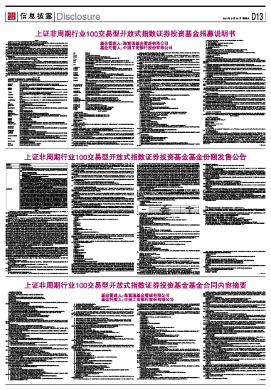 基金管理人:海富通基金管理有限公司 基金托管人:中国工商银行股份有限公司 重要提示 本基金经2011年2月23日中国证券监督管理委员会证监许可【2011】268号文核准募集。 基金管理人保证本招募说明书的内容真实、准确、完整。本招募说明书经中国证监会核准,但中国证监会对本基金募集的核准,并不表明其对本基金的价值和收益做出实质性判断或保证,也不表明投资于本基金没有风险。 基金管理人依照恪尽职守、诚实信用、谨慎勤勉的原则管理和运用基金资产,但不保证基金一定盈利,也不保证最低收益。当投资者赎回时,所得或会高于或低于投资者先前所支付的金额。 本基金投资于证券市场,基金净值会因为证券市场波动等因素产生波动。投资者在投资本基金前,需全面认识本基金产品的风险收益特征和产品特性,充分考虑自身的风险承受能力,理性判断市场,对投资本基金的意愿、时机、数量等投资行为作出独立决策。投资者根据所持有份额享受基金的收益,但同时也需承担相应的投资风险。投资本基金可能遇到的风险包括:标的指数回报与股票市场平均回报偏离的风险、标的指数波动的风险以及基金投资组合回报与标的指数回报偏离的风险,基金份额二级市场交易价格折溢价的风险,基金的退市风险,投资者申购、赎回失败的风险以及基金份额赎回对价的变现风险等等。本基金属股票基金,风险与收益高于混合基金、债券基金与货币市场基金。本基金为指数型基金,紧密跟踪标的指数,具有和标的指数所代表的股票市场相似的风险收益特征,属于证券投资基金中风险较高、收益较高的品种。 基金的过往业绩并不预示其未来表现。基金管理人所管理的其它基金的业绩并不构成对本基金业绩表现的保证。投资有风险,投资者在认购(或申购)本基金时应认真阅读本基金的招募说明书和基金合同。 第一节 绪言 本招募说明书依据《中华人民共和国证券投资基金法》(以下简称“《基金法》”)、《证券投资基金运作管理办法》(以下简称《运作办法》)、《证券投资基金销售管理办法》(以下简称《销售办法》)、《证券投资基金信息披露管理办法》(以下简称《信息披露办法》)及其他有关规定以及《上证非周期行业100交易型开放式指数证券投资基金合同》编写。 本招募说明书阐述了上证非周期行业100交易型开放式指数证券投资基金的投资目标、策略、风险、费率等与投资者投资决策有关的全部必要事项,投资者在作出投资决策前应仔细阅读本招募说明书。 基金管理人承诺本招募说明书不存在任何虚假记载、误导性陈述或者重大遗漏,并对其真实性、准确性、完整性承担法律责任。本基金是根据本招募说明书所载明的资料申请募集的。本基金管理人没有委托或授权任何其他人提供未在本招募说明书中载明的信息,或对本招募说明书作任何解释或者说明。 本招募说明书根据本基金的基金合同编写,并经中国证监会核准。基金合同是约定基金当事人之间权利、义务的法律文件。基金投资者自依基金合同取得基金份额,即成为基金份额持有人和基金合同的当事人,其持有基金份额的行为本身即表明其对基金合同的承认和接受,并按照《基金法》、基金合同及其他有关规定享有权利、承担义务。基金投资者欲了解基金份额持有人的权利和义务,应详细查阅基金合同。 第二节 释义 在本招募说明书中,除非文意另有所指,下列词语或简称具有如下含义: 基金或本基金 指上证非周期行业100交易型开放式指数证券投资基金 基金合同、本基金合同 指《上证非周期行业100交易型开放式指数证券投资基金基金合同》及对本基金合同的任何有效的修订和补充 招募说明书 指《上证非周期行业100交易型开放式指数证券投资基金招募说明书》,及其定期的更新 托管协议: 指基金管理人与基金托管人签订的《上证非周期行业100交易型开放式指数证券投资基金托管协议》及其 任何有效修订和补充 发售公告 指《上证非周期行业100交易型开放式指数证券投资基金基金份额发售公告》 法律法规 指中国现时有效并公布实施的法律、行政法规、部门规章及规范性文件以及对于该等法律文件的不时修改 和补充 《基金法》 指2003年10月28日经第十届全国人民代表大会常务委员会第五次会议通过,自2004年6月1日起实施 的《中华人民共和国证券投资基金法》及颁布机关对其不时作出的修订 《销售办法》 指中国证监会2004年6月25日颁布、同年7月1日实施的《证券投资基金销售管理办法》及对其不时作出 的修订 《运作办法》 指中国证监会2004年6月29日颁布、同年7月1日实施的《证券投资基金运作管理办法》及对其不时作出 的修订 《信息披露办法》 指中国证监会2004年6月8日颁布、同年7月1日实施的《证券投资基金信息披露管理办法》及对其不时 作出的修订 中国 指中华人民共和国(仅为基金合同目的不包括香港特别行政区、澳门特别行政区及台湾地区) 中国证监会 指中国证券监督管理委员会 银行监管机构 指中国银行业监督管理委员会或其他经国务院授权的机构 元 指人民币元 基金合同当事人 指受基金合同约束,根据基金合同享受权利并承担义务的法律主体,包括基金管理人、基金托管人和基金份 额持有人 基金管理人 指海富通基金管理有限公司 基金托管人 指中国