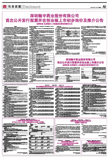 特别提示 深圳翰宇药业股份有限公司根据《证券发行与承销管理办法》(2010年10月 11日修订)和《关于深化新股发行体制改革的指导意见》以及《首次公开发行股票并在创业板上市管理暂行办法》首次公开发行股票(A股)并拟在创业板上市,本次初步询价和网下发行均采用深圳证券交易所(以下简称“深交所”)网下发行电子平台进行,请询价对象及其管理的配售对象认真阅读本公告。关于网下发行电子化的详细内容,请查阅深交所网站(www.szse.cn)公布的《深圳市场首次公开发行股票网下发行电子化实施细则》(2009年修订)。本次发行新增了推荐询价对象、网下摇号配售、估值与报价的信息披露等方面的内容。请询价对象及其管理的配售对象认真阅读本公告。 重要提示 1、深圳翰宇药业股份有限公司(以下简称“翰宇药业”或“发行人”)首次公开发行不超过2,500万股人民币普通股(A股)(以下简称“本次发行”)的申请已获中国证券监督管理委员会证监许可[2011]397号文核准。股票代码为“300199”,该代码同时适用于本次发行的初步询价及网上、网下申购。 2、本次发行采用网下向配售对象询价配售(以下简称“网下发行”)和网上向社会公众投资者定价发行(以下简称“网上发行”)相结合的方式进行,其中网下发行占本次最终发行数量的19.84%,即496万股;网上发行数量为本次发行最终发行数量减去网下最终发行数量。初步询价及网下发行由保荐机构(主承销商)中信建投证券有限责任公司(以下简称“中信建投证券”、“保荐机构”(主承销商))负责组织,通过深交所的网下发行电子平台实施,网上发行通过深交所交易系统进行。 3、本次发行的网下网上申购日为T日(2011年3月28日),参与申购的投资者须为在中国证券登记结算有限责任公司深圳分公司(以下简称“中国结算深圳分公司”)开立证券账户的机构投资者和根据创业板市场投资者适当性管理的相关规定已开通创业板市场交易的自然人(国家法律、法规禁止购买者除外)。发行人及保荐机构(主承销商)提醒投资者申购前确认是否具备创业板投资资格。 4、中信建投证券作为本次发行的保荐机构(主承销商)将于2011年3月21日(T-5日)至2011年3月23日(T-3日),组织本次发行的路演推介和初步询价。符合《证券发行与承销管理办法》(2010年10月 11日修订)要求的询价对象方可自主选择在深圳、上海或北京参加现场推介会。 5、可参与本次网下申购的询价对象为符合《证券发行与承销管理办法》(2010年10月11日修订)中界定的询价对象条件,且已在中国证券业协会(以下简称“协会”)登记备案的机构,包括中信建投证券自主推荐且已向协会报备的18家询价对象。 6、上述询价对象于初步询价截止日2011年3月23日(T-3日)12:00前在协会登记备案的自营业务或其管理的证券投资产品均为本次发行的配售对象,均可参与本次网下申购。主承销商自营账户、与发行人或保荐机构(主承销商)之间存在实际控制关系的询价对象、未参与初步询价或者参与初步询价但未有效报价的询价对象不得参与网下申购。 7、本次询价以配售对象为报价单位,采取价格与申购数量同时申报的方式进行。申报价格的最小变动单位为0.01元,每个配售对象最多可申报3档价格。配售对象自主决定是否参与初步询价,自行确定申报价格和申报数量。配售对象参与初步询价时须同时申报价格和数量,由询价对象通过深交所网下发行电子平台统一申报。询价对象应按规定进行初步询价,并自行承担相应的法律责任。 8、为促进询价对象认真定价,综合考虑本次网下发行数量及中信建投证券研究所对发行人的合理估值区间,主承销商将配售对象的最低申购数量和申报数量变动最小单位即“申购单位”均设定为62万股,即配售对象的每档申报数量必须是62万股的整数倍,每个配售对象的累计申购数量不得超过496万股。 9、发行人和保荐机构(主承销商)根据初步询价结果,按照申购价格由高到低进行排序、计算出每个价格上所对应的累计申购总量,综合考虑发行人基本面、所处行业、可比公司估值水平、市场情况、有效募集资金需求及承销风险等因素,协商确定发行价格。 10、发行价格确定后,报价不低于发行价格的配售对象方可参与本次网下申购。未参与初步询价或者参与初步询价但报价低于发行价格的配售对象不得参与本次网下申购。可参与网下申购的配售对象的申购数量应为初步询价中的有效申报数量。配售对象应按照确定的发行价格与申购数量的乘积缴纳申购款,未及时足额缴纳申购款的,将被视为违约并应承担违约责任,主承销商将违约情况报中国证监会和协会备案。 11、若网下有效申购总量大于本次网下发行数量,发行人和主承销商将通过摇号抽签方式进行配售。本次摇号采用按申购单位(62万股)配号的方法,主承销商将按配售对象的有效报价对应的申购量进行配号,每一申购单位获配一个编号,最终将摇出8个号码,每个号码可获配62万股股票。 若网下有效申购总量等于496万股,发行人和主承销商将按照配售对象的实际申购数量直接进行配售。 12、回拨安排:若 T日出现网上申购不足的情况,网上申购不足部分向网下回拨,由参与网下申购的机构投资者认购;网下机构投资者未能足额认购该申购不足部分的,未认购足额部分由主承销商推荐的投资者认购。在发生回拨