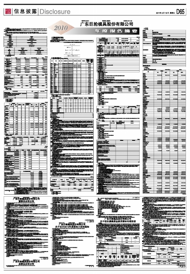 §1 重要提示 1.1 本公司董事会、监事会及其董事、监事、高级管理人员保证本报告所载资料不存在任何虚假记载、误导性陈述或者重大遗漏,并对其内容的真实性、准确性和完整性负个别及连带责任。 本年度报告摘要摘自年度报告全文,报告全文同时刊载于巨潮资讯网(www.cninfo.com.cn)。投资者欲了解详细内容,应当仔细阅读年度报告全文。 1.2 公司年度财务报告已经天健正信会计师事务所有限公司审计并被出具了标准无保留意见的审计报告。 1.3 公司负责人吴潮忠、主管会计工作负责人林瑞波及会计机构负责人(会计主管人员)谢金明声明:保证年度报告中财务报告的真实、完整。 §2 公司基本情况简介 2.1 基本情况简介 ■ 2.2 联系人和联系方式 ■ §3 会计数据和业务数据摘要 3.1 主要会计数据 单位:元 ■ 3.2 主要财务指标 单位:元 ■ 非经常性损益项目 √ 适用 □ 不适用 单位:元 ■ 3.3 境内外会计准则差异 □ 适用 √ 不适用 §4 股本变动及股东情况 4.1 股份变动情况表 单位:股 ■ 限售股份变动情况表 单位:股 ■ 4.2 前10名股东、前10名无限售条件股东持股情况表 单位:股 ■ 4.3 控股股东及实际控制人情况介绍 4.3.1 控股股东及实际控制人变更情况 □ 适用 √ 不适用 4.3.2 控股股东及实际控制人具体情况介绍 ■ 4.3.3 公司与实际控制人之间的产权及控制关系的方框图 ■ §5 董事、监事和高级管理人员 5.1 董事、监事和高级管理人员持股变动及报酬情况 ■ 董事、监事、高级管理人员报告期内被授予的股权激励情况 □ 适用 √ 不适用 5.2 董事出席董事会会议情况 ■ 连续两次未亲自出席董事会会议的说明 ■ §6 董事会报告 6.1 管理层讨论与分析 ■ 6.2 主营业务分行业、产品情况表 单位:万元 ■ 6.3 主营业务分地区情况 单位:万元 ■ 6.4 采用公允价值计量的项目 □ 适用 √ 不适用 6.5 募集资金使用情况对照表 √ 适用 □ 不适用 单位:万元 ■ 变更募集资金投资项目情况表 □ 适用 √ 不适用 6.6 非募集资金项目情况 □ 适用 √ 不适用 6.7 董事会对公司会计政策、会计估计变更或重大会计差错更正的原因及影响的说明 □ 适用 √ 不适用 6.8 董事会对会计师事务所“非标准审计报告”的说明 □ 适用 √ 不适用 6.9 董事会本次利润分配或资本公积金转增股本预案 ■ 公司最近三年现金分红情况表 单位:元 ■ 公司本报告期内盈利但未提出现金利润分配预案 □ 适用 √ 不适用 §7 重要事项 7.1 收购资产 □ 适用 √ 不适用 7.2 出售资产 □ 适用 √ 不适用 7.1、7.2所涉及事项对公司业务连续性、管理层稳定性的影响。 7.3 重大担保 □ 适用 √ 不适用 7.4 重大关联交易 7.4.1 与日常经营相关的关联交易 □ 适用 √ 不适用 7.4.2 关联债权债务往来 √ 适用 □ 不适用 单位:万元 ■ 其中:报告期内上市公司向控股股东及其子公司提供资金的发生额0.00万元,余额0.00万元。上述三人的发生额为差旅费备用金借款。 7.4.3 大股东及其附属企业非经营性资金占用及清偿情况表 □ 适用 √ 不适用 7.5 委托理财 □ 适用 √ 不适用 7.6 承诺事项履行情况 上市公司及其董事、监事和高级管理人员、公司持股5%以上股东及其实际控制人等有关方在报告期内或持续到报告期内的以下承诺事项 √ 适用 □ 不适用 ■ 7.7 重大诉讼仲裁事项 □ 适用 √ 不适用 7.8 其他重大事项及其影响和解决方案的分析说明 7.8.1 证券投资情况 □ 适用 √ 不适用 7.8.2 持有其他上市公司股权情况 □ 适用 √ 不适用 7.8.3 持有拟上市公司及非上市金融企业股权情况 □ 适用 √ 不适用 7.8.4 买卖其他上市公司股份的情况 □ 适用 √ 不适用 7.8.5 其他综合收益细目 单位:元 ■ §8 监事会报告 √ 适用 □ 不适用 ■ §9 财务报告 9.1 审计意见 ■ 9.2 财务报表 9.2.1 资产负债表 编制单位:广东巨轮模具股份有限公司 2010年12月31日 单位:元 ■ (下转D67版) 本版导读: