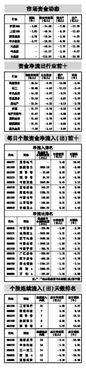 资金策市 Money Flow 各类资金当日净流量对比 据STCN资金流向快报(http://data.stcn.com/statisticalData.shtml)数据显示,11月18日,沪深两市共流出资金201.66亿元,连续第4个交易日净流出。其中,沪市净流出98.43亿元,深市净流出103.23亿元。主力资金合计流出56.81亿元。 指数方面,上证180指数成份股合计资金流出49.74亿元,深证成指成份股资金流出19.24亿元,沪深300指数成份股资金流出74.28亿元。以股本规模计,流通盘中大盘股资金流出48.14亿元,中盘股资金流出41.17亿元,小盘股资金流出112.35亿元。 行业方面,按照衍生申万一级行业分类计,有25个行业资金净流出。其中机械设备流出资金20.24亿,有较明显的资金出逃现象。 化工业已持续4个交易日净流出资金,共流出资金48.67亿,为行业连续流出天数榜第一。 工商银行已持续21个交易日净流入资金,累计流入资金4.80亿,居个股连续流入天数榜首位。冠福家用已持续18个交易日净流出资金,累计流出资金5.44亿,为个股连续流出天数榜第一。 股指期货方面,IF1111合约收报2608.80点,下跌2.27%;成交1.23万手,持仓量减4217手,收报0.12万手;资金共流出1.89亿。(黄舒欣) (本栏目数据来源:名策数据) 本版导读: