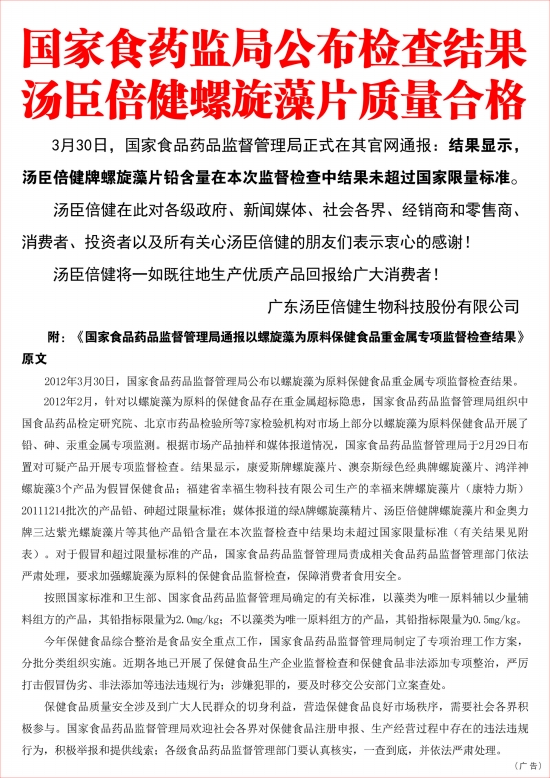 [AD]国家食药监局公布检查结果汤臣倍健螺旋藻片质量合格