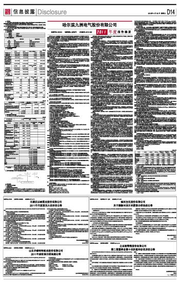 哈尔滨九洲电气股份有限公司2011年度报告摘要 2012-04-20 来源:证券时报网 作者: