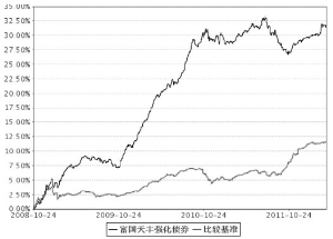 注:截止日期为2012年03月31日。 本基金合同生效日为2008年10月24日,建仓期6个月,即从2008年10月24日起至2009年4月23日,建仓期结束时各项资产配置比例均符合基金合同约定。 §4 管理人报告 4.1 基金经理(或基金经理小组)简介 ■ 4.2 报告期内本基金运作遵规守信情况说明 本报告期,富国基金管理有限公司作为富国天丰强化收益债券型证券投资基金的管理人严格按照《中华人民共和国证券投资基金法》、《中华人民共和国证券法》、《富国天丰强化收益债券型证券投资基金基金合同》以及其它有关法律法规的规定,本着诚实信用、勤勉尽责的原则管理和运用基金资产,以为投资者减少和分散风险,确保基金资产的安全并谋求基金长期稳定收益为目标,管理和运用基金资产,无损害基金持有人利益的行为,基金投资组合符合有关法规及基金合同的规定。 4.3 公平交易专项说明 4.3.1公平交易制度的执行情况 本基金管理人根据相关法规要求,结合实际情况,制定了内部的《公平交易管理办法》,对证券的一级市场申购、二级市场交易相关的研究分析、投资决策、授权、交易执行、业绩评估等投资管理环节,实行事前控制、事中监控、事后评估及反馈的流程化管理。在制度、操作层面确保各组合享有同等信息知情权、均等交易机会,并保持各组合的独立投资决策权。 事前控制主要包括:1、一级市场,通过标准化的办公流程,对关联方审核、价格公允性判断及证券公平分配等相关环节进行控制;2、二级市场,通过交易系统的投资备选库、交易对手库及授权管理,对投资标的、交易对手和操作权限进行自动化控制。 事中监控主要包括组合间相同投资标的的交易方向、市场冲击的控制,银行间市场交易价格的公允性评估等。1、将主动投资组合的同日反向交易列为限制行为,非经特别控制流程审核同意,不得进行;对于同日同向交易,通过交易系统对组合间的交易公平性进行自动化处理。2、同一基金经理管理的不同组合,对同一投资标的采用相同投资策略的,必须通过交易系统采取同时、同价下达投资指令,确保公平对待其所管理的组合。 事后评估及反馈主要包括组合间同一投资标的的临近交易日的同向交易和反向交易的合理性分析评估,以及不同时间窗口下(1日、3日、5日)的季度公平性交易分析评估等。1、通过公平性交易的事后分析评估系统,对涉及公平性交易的投资行为进行分析评估,分析对象涵盖公募、年金、社保及专户产品,并重点分析同类组合(股票型、混合型、债券型)间、不同产品间以及同一基金经理管理不同组合间的交易行为,若发现异常交易行为,监察稽核部视情况要求相关当事人做出合理性解释,并按法规要求上报辖区监管机构。2、季度公平性交易分析报告按规定经基金经理或投资经理签字,并经督察长、总经理审阅签字后,归档保存,以备后查。 本报告期内公司旗下基金严格遵守公司的相关公平交易制度,未出现违反公平交易制度的情况。 4.3.2异常交易行为的专项说明 本报告期内未发现异常交易行为。 公司旗下管理的各投资组合在交易所公开竞价同日反向交易的控制方面,未出现成交较少的单边交易量超过该证券当日成交量5%的情况,亦未受到监管机构的相关调查。 4.4 报告期内基金的投资策略和业绩表现说明 4.4.1报告期内基金投资策略和运作分析 1季度经济增速和物价水平同步回落,债券市场流动性改善,配置需求增加,投资者对信用产品的风险偏好提升,信用产品表现强于利率产品。沪深300指数先升后跌,季度涨幅4.65%。 报告期内本基金坚持以信用产品为主要标的的投资策略,同时适度增加了对可转债的配置和新股申购力度。债券投资和股票投资均为基金净值带来正的贡献。 4.4.2报告期内基金的业绩表现 本报告期,本基金净值增长率为1.73%,业绩比较基准收益率为0.87%。 §5 投资组合报告 5.1 报告期末基金资产组合情况 ■ 5.2 报告期末按行业分类的股票投资组合 ■ 5.3 报告期末按公允价值占基金资产净值比例大小排序的前十名股票投资明细 ■ 5.4 报告期末按债券品种分类的债券投资组合 ■ 5.5 报告期末按公允价值占基金资产净值比例大小排名的前五名债券投资明细 ■ 5.6 报告期末按公允价值占基金资产净值比例大小排名的前十名资产支持证券投资明细 注:本基金本报告期末未持有资产支持证券。 5.7 报告期末按公允价值占基金资产净值比例大小排名的前五名权证投资明细 注:本基金本报告期末未持有权证。 5.8 投资组合报告附注 5.8.1申明本基金投资的前十名证券的发行主体本期是否出现被监管部门立案调查,或在报告编制日前一年内受到公开谴责、处罚的情形。 报告期内本基金投资的前十名证券的发行主体没有被监管部门立案调查或在本报告编制日前一年内受到公开谴责、处罚的情况。 5.8.2申明基金投资的前十名股票是否超出基金合同规定的备选股票库。 报告期内本基金投资的前十名股票中没有在备选股票库之外的股票。 5.8.3其他资产构成 ■ 5.8.4报告期末持有的处于转股期的可转换债券明细 ■ 5.8.5报告期末前十名股票中存在流通受限情况的说明 ■ 5.8.6 投资组合报告附注的其他文字描述部分。 因四舍五入原因,投资组合报告中市值占净值比例的分项之和与合计可能存在尾差。 §6 开放式基金份额变动 单位:份 ■ §7 备查文