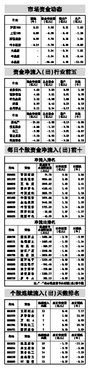 据STCN资金流向快报(http://data.stcn.com/statisticalData.shtml)数据显示,4月26日,沪深两市共流出资金56.77亿元,资金结束昨日的流入状态,转而流出。其中,沪市净流出30.56亿元,深市净流出26.21亿元。主力资金合计流出7.69亿元。 指数方面,上证180指数成份股合计资金流出6.50亿元,深证成指成份股资金流入5.70亿元,沪深300指数成份股资金流入5.38亿元。以股本规模计,流通盘中大盘股资金流入3.24亿元,中盘股资金流出3.54亿元,小盘股资金流出56.40亿元。 行业方面,按照衍生申万一级行业分类计,有5个行业资金净流入,20个行业资金净流出。其中,食品饮料流入资金4.62亿,成为资金最关注的行业;房地产流出资金13.26亿,有较明显的资金出逃现象。 有色金属业已持续2个交易日净流入资金,共流入资金9.96亿,居行业连续流入天数榜首位。信息设备业已持续6个交易日净流出资金,共流出资金14.83亿,为行业连续流出天数榜第一。 太阳纸业已持续12个交易日净流入资金,累计流入资金0.41亿,居个股连续流入天数榜首位。凯恩股份已持续25个交易日净流出资金,累计流出资金1.75亿,为个股连续流出天数榜第一。 股指期货方面,IF1205合约收报2638.80点,微涨0.40%;成交30.55万手,持仓量增569手,收报4.55万手;资金共流出2.98亿。(黄舒欣) (本栏目数据来源:名策数据) 本版导读: