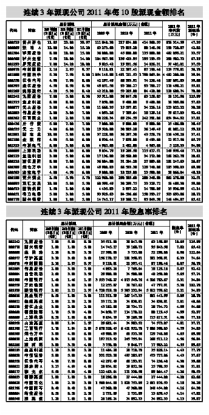 (注:数据基于模型测算,不构成投资建议,仅供投资者参考。更多详情:http://idea.stcn.com) 随着上市公司2011年业绩逐一亮相,年报披露工作已经进入尾声。上市公司分红一直是年报一大看点,数据显示,从2009年至2011年,每年派现A股公司分别为954家、1267家和1551家,派现家数呈现逐年上升态势。进一步统计发现,在剔除2010年以后上市的公司后,共有671家公司近3年连续派现,而其中的100家公司今年派送上市以来最厚红包。 截至昨日,2244家A股上市公司公布年报,其中已经实施或者公布派现预案的公司为1551家,占比七成。去年中国证监会新主席郭树清上任后第一把火烧向了上市公司的分红制度,意欲提升股东回报。此举被市场认为有利于投资者理性投资,营造重投资而非重投机的市场环境。从目前的数据来看,今年派现的公司比例比去年提高近一成。 股息率是衡量上市公司回报投资者的重要指标,随着年报披露渐近尾声,股息率也成为了评价股票投资价值的标准之一。统计671家公司每股派现金额(含税),参考去年底收盘价,共有49家公司的股息率高于一年期定期存款利率3.5%。九阳股份拟每股派现0.13元(含税),加上去年中期每股派现0.70元(含税),股息率达到了10.65%,远远高于一年期定存。此外,新兴铸管、盐田港、宁沪高速和中材国际的股息率均高于6%。 只考虑股息率也许并不全面,那些连续多年进行高比例分红的公司也具有高回报特点。统计显示,671家公司中,近3年派现率均在30%以上的公司共有206家,占比三成。其中,又有35家公司不仅近3年派现率均在30%以上,并且呈现出逐年递增的态势。 置信电气于2003年上市至今,连续9年每年均有大小不一的“红包”回馈投资者。2009年至2011年,每10股派现金额(含税)分别为3元、4元、4元,派现总金额为18561.15万元、24748.2万元和24748.2万元,3年间派现率呈逐年走高态势,各自为72.66%、77.38%和150.73%。 从每10股派现金额来看,在近3年持续派现的671家公司中,共有130家公司2011年每10股派现金额位于上市以来最高水平,如果剔除历史上某些年份每10股派现金额和派现总额均与2011年派现方案相同的公司后,有100家公司派送上市以来最厚红包。 从上市时间来看,100家公司中有37家公司上市超过10年,上市超过5年的达66家。国药一致是100家公司中上市时间最久的公司,该公司自1993年上市后,其中有10个年度选择派现,其中大多数年度每10股派现均维持在0.25元至0.9元之间。自2009年开始,红包逐年增厚,终于将在2012年派出上市以来最厚红包。 若从100家公司中每10股派现金额(含税)看,贵州茅台、张裕A、洋河股份和泸州老窖4家公司每10股派现金额均超过10元,位居前列。若从派现率来看,则九阳股份、羚锐制药、长江投资和海利得等27家公司2011年度的派现率均超过50%。(陈文彬) 本版导读: