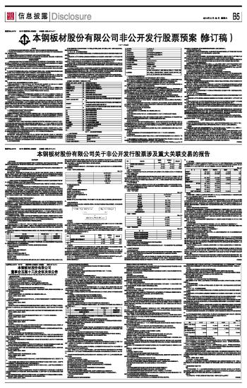 证券代码:000761 200761 股票简称:本钢板材 本钢板B 编号:2012-016 本钢板材股份有限公司 董事会五届十三次会议决议公告 本公司及董事会全体成员保证信息披露内容的真实、准确和完整,没有虚假记载、误导性陈述或重大遗漏。 一、董事会会议召开情况 1、董事会于2012年5月14日以书面形式发出会议通知。 2、2012年5月25日上午9时在本钢宾馆会议室召开董事会会议。 3、本次董事会会议应出席董事人数为7人,实际出席会议的董事人数7人。 4、本次董事会会议的主持人为董事长张晓芳女士,公司监事、高级管理人员列席了会议。 5、本次董事会会议的召开符合法律、行政法规、部门规章、规范性文件和《公司章程》的有关规定。 二、董事会会议审议情况 (一)、审议通过了《关于公司向特定对象非公开发行A股方案的议案(修订稿)》。 根据《深圳证券交易所股票上市规则》及公司章程的相关规定,关联董事张晓芳、曹爱民、唐朝盛对此议案回避表决,由4名非关联董事对该议案逐项进行表决: 1、发行股票的种类和面值 本次拟发行的股票种类为境内上市人民币普通股(A股),每股面值为人民币1.00元。 表决结果:4票同意,0票反对,0票弃权 2、发行方式 本次发行的股票全部采取向特定对象非公开发行的方式。公司将在中国证监会核准后6个月内选择适当时机向不超过十名特定对象发行A股股票。 表决结果:4票同意,0票反对,0票弃权 3、发行对象 本次非公开发行的发行对象范围为境内注册的证券投资基金管理公司、证券公司、财务公司、资产管理公司、保险机构、信托投资公司(以其自有资金)、QFII以及其他合格的投资者,特定对象均以现金认购。上述发行对象与公司不存在关联关系。 具体发行对象,公司将在取得本次发行核准文件后,按照《上市公司非公开发行股票实施细则》的规定以竞价方式确定。 表决结果:4票同意,0票反对,0票弃权 4、锁定期 本次非公开发行股票完成后,发行对象所认购的股份自发行结束之日起十二个月内不得上市交易或转让。 表决结果:4票同意,0票反对,0票弃权 5、认购方式 特定对象投资者将以现金方式认购本次拟发行的全部股份。 表决结果:4票同意,0票反对,0票弃权 6、发行数量 本次非公开发行股票数量不超过6.98亿股。若公司股票在定价基准日至发行日期间发生派发股利、送红股、转增股本、增发新股或配股等除息、除权行为,发行股数按照总股本变动的比例相应调整。 股东大会已授权董事会在该范围内根据实际情况与本次非公开发行股票的保荐人(主承销商)协商确定最终发行数量。 表决结果:4票同意,0票反对,0票弃权 7、定价基准日及发行价格 本次非公开发行的定价基准日为公司第五届董事会第十三次会议决议公告日。 根据《非公开发行股票实施细则》,非公开发行的发行价格不低于定价基准日前20个交易日公司A股股票交易均价的90%即4.69元/股(定价基准日前20个交易日A股股票交易均价=定价基准日前20个交易日A股股票交易总额/定价基准日前20个交易日A股股票交易总量)。 同时根据国有资产管理相关规定和辽宁省国资委的要求,本次非公开发行价格不得低于上市公司2011年末经审计每股净资产,即4.95元/股。 综合考虑,本次非公开发行底价确定为5元/股。 具体发行价格将在公司取得中国证监会关于本次非公开发行的核准批文后,由公司董事会根据股东大会的授权,按照《上市公司非公开发行股票实施细则》等规定,根据竞价结果与本次发行的保荐人(主承销商)协商确定。 在本次发行定价基准日至发行日期间,若公司发生派发股利、送红股、转增股本或配股等除权、除息事项,本次发行的发行价格下限亦将作相应调整。 表决结果:4票同意,0票反对,0票弃权 8、上市地点 本次发行的股票锁定期满后,将在深圳证券交易所上市交易。 表决结果:4票同意,0票反对,0票弃权 9、募集资金用途 本次非公开发行股票的募集资金总额预计不超过34.88亿元,扣除发行费用后募集资金净额34.18亿元,拟投资于以下项目: (1)购买本溪钢铁(集团)有限责任公司持有的本钢浦项冷轧薄板有限责任公司75%股权,评估价12.66亿元,上述资产转让价格将按照经辽宁省国资委核准的评估值确定,全部以募集资金投入。 (2)购买本溪钢铁(集团)有限责任公司持有的徐家堡子铁矿探矿权,评估价13.02亿元,上述资产转让价格将按照经辽宁省国资委核准的评估值确定,全部以募集资金投入。 (3)补充公司流动资金8.5亿元。 实际募集资金净额将以不超过项目资金需求量为限,若本次发行实际募集资金低于计划投资的金额,不足部分通过自有资金或银行借款解决。公司可根据主管部门要求和市场的实际情况,对上述单个或多个投入项目的募集资金拟投入金额进行调整。 根据《深圳证券交易所股票上市规则》及公司章程的相关规定,由于该议案涉及公司与控股股东本钢集团的关联交易,关联董事张晓芳、曹爱民、唐朝盛回避了对此议案的表决,由4名非关联董事进行表决。 表决结果:4票同意,0票反对,0票弃权 10、本次非公开发行前的滚存未分配利润安排 本次非公开发行完成后,公司的新老股东共同分享公司本次非公开发行前滚存的未分配利润。 表决结果:4票同意,0票反对,0票弃权 11、本次非公开发行决议的有效期 本次发行决议的有效期为自公司股东大会审议通过本次非公开发行
