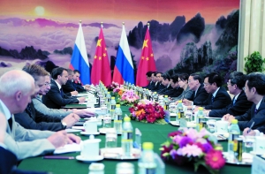 国务院副总理王岐山昨日同俄罗斯副总理德沃尔科维奇会晤时表示,中俄能源合作面临重要机遇,双方应从战略高度坚定不移地推进中俄天然气合作。双方应进一步扩大原油贸易,加强石油领域上下游一体化合作。继续深化核能合作,平衡推动田湾二期、示范快堆、实验快堆、核燃料、浮动核电站、空间核动力等领域合作。 (中新社/供图) 本版导读: