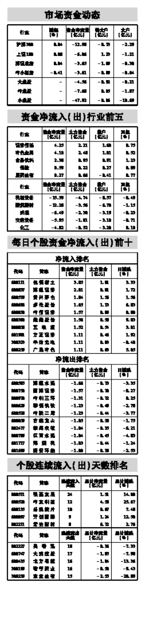 据STCN资金流向快报(http://data.stcn.com/statisticalData.shtml)数据显示,6月1日,沪深两市共流出资金60.16亿元,连续第3个交易日净流出。其中,沪市净流出23.69亿元,深市净流出36.47亿元。主力资金合计流出13.71亿元。 指数方面,上证180指数成份股合计资金流出6.06亿元,深证成指成份股资金流出3.65亿元,沪深300指数成份股资金流出12.98亿元。以股本规模计,流通盘中大盘股资金流出4.56亿元,中盘股资金流出7.68亿元,小盘股资金流出47.92亿元。 行业方面,按照衍生申万一级行业分类计,有5个行业资金净流入,20个行业资金净流出。其中,证券信托流入资金4.25亿,成为资金最关注的行业;机械设备流出资金15.59亿,有较明显的资金出逃现象。 证券信托业已持续5个交易日净流入资金,共流入资金34.52亿,居行业连续流入天数榜首位。餐饮旅游业已持续8个交易日净流出资金,共流出资金5.30亿,为行业连续流出天数榜第一。 银基发展已持续24个交易日净流入资金,累计流入资金1.51亿,居个股连续流入天数榜首位。奥特迅已持续18个交易日净流出资金,累计流出资金0.36亿,为个股连续流出天数榜第一。 股指期货方面,IF1206合约收报2629.20点,微跌0.10%;成交38.57万手,持仓量减3099手,收报4.17万手;资金共流出24.34亿。(黄舒欣) (本栏目数据来源:名策数据) |