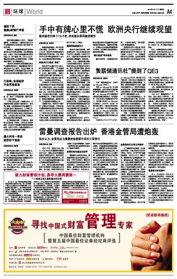 雷曼调查报告出炉 香港金管局遭炮轰报告认为,金管局应为雷曼迷你债事件承担主要责任 2012-06-07 来源:证券时报网 作者:徐欢