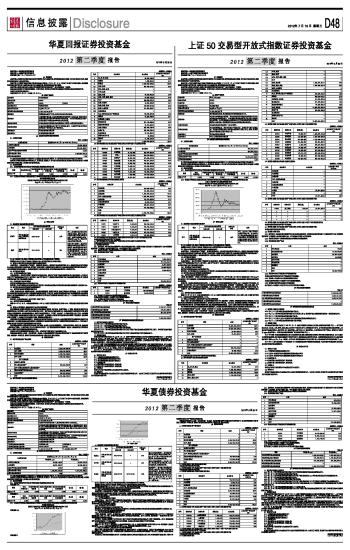 基金管理人:华夏基金管理有限公司 基金托管人:中国工商银行股份有限公司 报告送出日期:二〇一二年七月十八日 §1 重要提示 基金管理人的董事会及董事保证本报告所载资料不存在虚假记载、误导性陈述或重大遗漏,并对其内容的真实性、准确性和完整性承担个别及连带责任。 基金托管人中国工商银行股份有限公司根据本基金合同规定,于2012年7月16日复核了本报告中的财务指标、净值表现和投资组合报告等内容,保证复核内容不存在虚假记载、误导性陈述或者重大遗漏。 基金管理人承诺以诚实信用、勤勉尽责的原则管理和运用基金资产,但不保证基金一定盈利。 基金的过往业绩并不代表其未来表现。投资有风险,投资者在作出投资决策前应仔细阅读本基金的招募说明书。 本报告中财务资料未经审计。 本报告期自2012年4月1日起至6月30日止。 §2 基金产品概况 ■ §3 主要财务指标和基金净值表现 3.1 主要财务指标 单位:人民币元 ■ 注:①所述基金业绩指标不包括持有人认购或交易基金的各项费用,计入费用后实际收益水平要低于所列数字。 ②本期已实现收益指基金本期利息收入、投资收益、其他收入(不含公允价值变动收益)扣除相关费用后的余额,本期利润为本期已实现收益加上本期公允价值变动收益。 3.2 基金净值表现 3.2.1 基金份额净值增长率及其与同期业绩比较基准收益率的比较 ■ 3.2.2 自基金合同生效以来基金份额累计净值增长率变动及其与同期业绩比较基准收益率变动的比较 上证50交易型开放式指数证券投资基金 份额累计净值增长率与业绩比较基准收益率历史走势对比图 (2004年12月30日至2012年6月30日) ■ §4 管理人报告 4.1 基金经理(或基金经理小组)简介 ■ 注:①上述任职日期、离任日期根据本基金管理人对外披露的任免日期填写。 ②证券从业的含义遵从行业协会《证券业从业人员资格管理办法》的相关规定。 4.2 管理人对报告期内本基金运作遵规守信情况的说明 本报告期内,本基金管理人严格遵守《证券投资基金法》、《证券投资基金销售管理办法》、《证券投资基金运作管理办法》、基金合同和其他有关法律法规、监管部门的相关规定,依照诚实信用、勤勉尽责、安全高效的原则管理和运用基金资产,在认真控制投资风险的基础上,为基金份额持有人谋求最大利益,没有损害基金份额持有人利益的行为。 4.3 公平交易专项说明 4.3.1 公平交易制度的执行情况 本基金管理人一贯公平对待旗下管理的所有基金和组合,制定并严格遵守相应的制度和流程,通过系统和人工等方式在各环节严格控制交易公平执行。报告期内,本公司严格执行了《证券投资基金管理公司公平交易制度指导意见》和《华夏基金管理有限公司公平交易制度》的规定。 4.3.2 异常交易行为的专项说明 报告期内未发现本基金存在异常交易行为。 报告期内,所有投资组合参与的交易所公开竞价同日反向交易成交较少的单边交易量未超过该证券当日成交量的5%。 4.4 报告期内基金的投资策略和业绩表现说明 4.4.1 报告期内基金投资策略和运作分析 2季度,国内通胀进一步回落,经济增速及企业盈利增速继续下滑,央行年内第二次下调了存款准备金率,并自2008年底以来首次下调了基准利率,宏观政策继续维持预调微调,投资者对于经济数据的预测以及放松政策的预期成为影响市场的主要因素。 市场方面,A股整体呈现先扬后抑的走势。4月至5月初,投资者预期政策将有所宽松,加之A股估值处于历史低位,市场出现一波反弹行情;之后,由于对经济基本面和政策放松低于预期的担忧,市场出现一定幅度回调。期间,保险、证券、地产类股票表现相对较好,银行股则总体表现较弱。上证50指数银行类股票权重超过35%,报告期内表现略弱于市场平均水平。 在操作中,我们严格按照基金合同要求,在指数权重及成份股变动时,尽量降低成本、减少市场冲击,逐步调整组合至目标结构。 4.4.2 报告期内基金的业绩表现 截至2012年6月30日,本基金份额净值为1.737元,本报告期份额净值增长率为1.66%,同期上证50指数增长率为0.19%。本基金本报告期跟踪偏离度为+1.47%。 4.5 管理人对宏观经济、证券市场及行业走势的简要展望 展望3季度,国内经济将继续放缓,企业盈利增速仍可能下滑,通胀将进一步回落,宏观政策仍将维持预调微调,有关金融改革及扶持民间资本的政策有望陆续出台,流动性总体会保持中性状态。我们认为,市场出现大幅调整的可能性较小,但也缺乏整体性投资机会,仍可能维持震荡行情,但如果政策出现超预期放松,上证50指数可能会有相对较好的表现。 我们将继续有效控制基金的跟踪偏离度和跟踪误差,以实现投资者获取指数投资收益及其他模式盈利的投资目标。同时,我们也积极争取推动产品的进一步创新,充分发挥ETF的功能,为各类投资者提供更多、更好的投资机会。 珍惜基金份额持有人的每一分投资和每一份信任,本基金将继续奉行华夏基金管理有限公司“为信任奉献回报”的经营理念,规范运作,审慎投资,勤勉尽责地为基金份额持有人谋求长期、稳定的回报。 §5 投资组合报告 5.1 报告期末基金资产组合情况 金额单位:人民币元 ■ 注:股票投资的公允价值包含可退替代款的估值增值。 5.2 报告期末按行业分类的股票投资组合 金额单位:人民币元 ■ ■ 5.3 报告期末按公