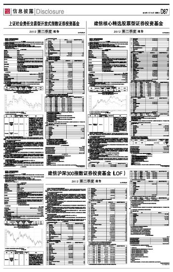 基金管理人:建信基金管理有限责任公司 基金托管人:中国工商银行股份有限公司 报告送出日期:2012年7月18日 §1 重要提示 基金管理人的董事会及董事保证本报告所载资料不存在虚假记载、误导性陈述或重大遗漏,并对其内容的真实性、准确性和完整性承担个别及连带责任。 基金托管人中国工商银行股份有限公司根据本基金合同规定,于2012年7月16日复核了本报告中的财务指标、净值表现和投资组合报告等内容,保证复核内容不存在虚假记载、误导性陈述或者重大遗漏。 基金管理人承诺以诚实信用、勤勉尽责的原则管理和运用基金资产,但不保证基金一定盈利。 基金的过往业绩并不代表其未来表现。投资有风险,投资者在作出投资决策前应仔细阅读本基金的招募说明书。 本报告中财务资料未经审计。 本报告期自2012年4月1日起至6月30日止。 §2 基金产品概况 ■ §3 主要财务指标和基金净值表现 3.1主要财务指标 单位:人民币元 ■ 注:1、本期已实现收益指基金本期利息收入、投资收益、其他收入(不含公允价值变动损益)扣除相关费用后的余额,本期利润为本期已实现收益加上本期公允价值变动损益。 2、所述基金业绩指标不包括持有人认购或交易基金的各项费用,计入费用后实际收益水平要低于所列数字。 3.2 基金净值表现 3.2.1 本报告期基金份额净值增长率及其与同期业绩比较基准收益率的比较 ■ 3.2.2自基金合同生效以来基金累计份额净值增长率变动及其与同期业绩比较基准收益率变动的比较 上证社会责任交易型开放式指数证券投资基金 份额累计净值增长率与业绩比较基准收益率历史走势对比图 (2010年5月28日至2012年6月30日) ■ 注:本报告期,本基金的投资组合比例符合基金合同的要求。 §4 管理人报告 4.1基金经理(或基金经理小组)简介 ■ 4.2 管理人对报告期内本基金运作遵规守信情况的说明 本报告期内,基金管理人不存在损害基金份额持有人利益的行为。基金管理人勤勉尽责地为基金份额持有人谋求利益,严格遵守了《证券法》、《证券投资基金法》、其他有关法律法规的规定和《上证社会责任交易型指数证券投资基金基金合同》的规定。 4.3 管理人对报告期内公平交易情况的专项说明 4.3.1 公平交易制度的执行情况 为了公平对待投资人,保护投资人利益,避免出现不正当关联交易、利益输送等违法违规行为,公司根据《证券投资基金法》、《证券投资基金管理公司内部控制指导意见》、《证券投资基金公司公平交易制度指导意见》、《基金管理公司特定客户资产管理业务试点办法》等法律法规和公司内部制度,制定和修订了《公平交易管理办法》、《异常交易管理办法》、《公司防范内幕交易管理办法》、《利益冲突管理办法》等风险管控制度。公司使用的交易系统中设置了公平交易模块,一旦出现不同基金同时买卖同一证券时,系统自动切换至公平交易模块进行操作,确保在投资管理活动中公平对待不同投资组合,严禁直接或通过第三方的交易安排在不同投资组合之间进行利益输送。 4.3.2 异常交易行为的专项说明 本报告期内未出现所有投资组合参与的交易所公开竞价同日反向交易成交较少的单边交易量超过该证券当日成交量的5%的情况。本报告期,未发现本基金存在异常交易行为。 4.4 报告期内基金的投资策略和业绩表现说明 4.4.1报告期内基金投资策略和运作分析 在报告期内,本基金根据基金合同规定,采取了对指数的被动复制策略,将年化跟踪误差和日均跟踪偏离度控制在了基金合同约定的范围之内。 报告期内,本基金跟踪误差主要来自基金净值保留位数有限造成的舍入误差以及所持股票组合与所跟踪标的指数在权重结构上的差异。权重结构上的差异源自部分股票由于舍入取整等原因,申购赎回清单文件中各股票的权重与标的指数相比有所变化。同时各成分股在二季度集中大比例分红也对跟踪误差有较大影响。本基金管理人在量化分析基础上,采取了适当的组合调整策略,尽可能地控制了基金的跟踪误差与偏离度。 在二季度末,本基金管理人根据即将到来的责任指数成分股变动提前进行了调仓,以减少冲击成本,同时控制了跟踪误差。 4.4.2报告期内基金的业绩表现 本基金本报告期净值增长率1.50%,波动率 1.12%,业绩比较基准收益率0.09%,波动率1.12%。 4.5 管理人对宏观经济、证券市场及行业走势的简要展望 在二季度初,对政策放松的预期带来了市场的探底回升,但随后欧债危机的进一步发展及国内经济形势的恶化使市场重新步入下跌轨道。展望2012年三季度,经济的基本面仍然不容乐观,各经济指标仍在低点徘徊,流动性虽有好转,但需求不足,预计指数仍将维持振荡走势。 本基金管理人将根据基金合同,以量化分析研究为基础,克服各种因素的不利影响,不断优化和改进量化模型,将基金的跟踪误差及偏离度保持在较低水平。 §5 投资组合报告 5.1 报告期末基金资产组合情况 ■ 5.2 报告期末按行业分类的股票投资组合 5.2.1 积极投资按行业分类的股票投资组合 本基金本报告期末未持有积极投资股票。 5.2.2 指数投资按行业分类的股票投资组合 ■ 注:以上行业分类以2012年6月30日的证监会行业分类标准为依据。 5.3 期末按公允价值占基金资产净值比例大小排序的股票投资明细 5.3.1期末指数投资按公允价值占基金资产净值比