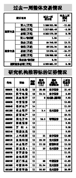 一、两融交易分析 1、过去一周整体交易情况。上周融资融券余额持续之前的增长势头,截至7月20日融资融券余额为639.31亿元,环比前周增长0.58%,融资仍是两融业务主体,占去97.95%的份额,融券业务仅占2.05%的份额。值得注意的是,该周中融资买入额、融资偿还额皆呈现下降趋势,而融券卖出量及融券偿还量则呈现增长态势。 2、过去一周两融标的证券交易情况。上周融资余额增幅最高的3只证券分别是洋河股份、新希望、江铃汽车。洋河股份近日公告了2012年半年度业绩预告的修正公告,称公司由于产品销售结构进一步优化,销售收入稳健增长等原因,导致2012年1~6月业绩超出预期;新希望于7月14日发布2012年半年度业绩预增公告,公告披露公司的归属于上市公司股东的净利润比上年同期增加80%~130%。江铃汽车也于近日公布了2012年中期的业绩快报。此外,本周融券余额增幅最高的3只证券分别为中国中冶、葛洲坝、鞍钢股份。 3、券商会员两融客户交易活跃度(深市)。上周,券商会员融资融券专用席位交易金额(深市),成交总量比上周下降4.07%,其中华鑫证券、上海证券、日信证券等客户交易活跃度增加显著,而上海证券、日信证券的客户交易活跃度也明显增加。华鑫证券上周交易金额较前周增长1437.25%,上海证券、日信证券增幅都超过300%,湘财证券和中金上周环比增幅也超过了100%。 二、本周机构推荐与预警标的证券情况 1、研究机构推荐标的证券情况。据巨潮汇总各家券商的研报数据统计,本周被机构推荐最多的3只标的券分别是格力电器(18家)、苏宁电器(18家)、民生银行(17家)。值得注意的是,连续两周以来,在推荐家数最多前20名标的股票中,银行与地产业股票超过半数。其中,东方证券对苏宁电器给出的最高目标价为13.14元,比苏宁电器上周五收盘价有近91.82%的上升空间。而上汽集团、深发展A、潞安环能的券商评估最高价也比其最近收盘价有超过60%的涨幅。另外,值得关注的是,有4只标的证券被研究机构预警,分别是:南京银行、大同煤业、宁波银行、华夏银行,4只标的证券均被高盛高华预警。 2、研究机构推荐的行业情况。据巨潮汇总各家券商的研报数据统计,本周被机构推荐最多的行业为房地产业,与当前对经济宽松的预期是吻合的。此外,机构推荐较多的行业还有煤炭行业、银行业、汽车行业、食品饮料行业、有色金属行业等。 三、本周重要提示 1、本周重要宏观事件日期提示。国内方面,国家统计局将于本周五7月27日上午9:30公布6月份的工业经济效益月度报告;而中国人民银行原定于周一(7月23日)公布社会融资规模统计数据。在国际方面,澳大利亚、美国、日本等将公布消费指数,英国、美国也将公布二季度的GDP增长情况,而新西兰央行在周四也将就利率作出决定。 2、标的证券重要提示。本周是分红派息除权和年度股东大会召开的高峰期,预计将有13只标的证券分红派息除权,14只标的证券召开股东大会,东方航空将有290400万股股改限售股上市流通,占其总股本25.75%。另外,华闻传媒等8只两融标的股票将于本周披露2012年中报。(数据来源:深圳证券信息有限公司,网络数据部编辑整理) (注:数据基于模型测算,不构成投资建议,仅供投资者参考。更多详情:http://idea.stcn.com) 本版导读:
