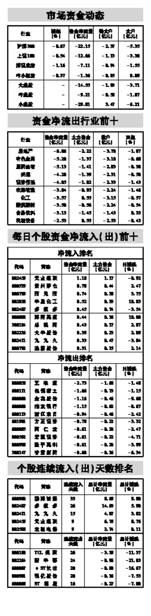 据STCN资金流向快报(http://data.stcn.com/statisticalData.shtml)数据显示,7月25日,沪深两市流出资金53.58亿元,资金结束昨日流入状态,转而流出。其中,沪市净流出32.67亿元,深市净流出20.90亿元。主力资金合计流出10.83亿元。 指数方面,上证180指数成份股合计资金流出12.66亿元,深证成指成份股资金流出7.11亿元,沪深300指数成份股资金流出22.15亿元。以股本规模计,流通盘中大盘股资金流出14.55亿元,中盘股资金流出9.21亿元,小盘股资金流出29.81亿元。 行业方面,按照衍生申万一级行业分类计,有3个行业资金净流入,22个行业资金净流出。其中,信息服务流入资金0.71亿,成为资金最关注行业;房地产流出资金6.86亿,有较明显资金出逃现象。 信息服务业已持续2个交易日净流入资金,共流入资金1.55亿,居行业连续流入天数榜首位。有色金属业已持续4个交易日净流出资金,共流出资金23.13亿,为行业连续流出天数榜第一。 渤海活塞已持续33个交易日净流入资金,累计流入资金8.69亿,居个股连续流入天数榜首位。TCL集团已持续26个交易日净流出资金,累计流出资金3.39亿,为个股连续流出天数榜第一。 股指期货方面,IF1208合约收报2374.00点,微跌0.48%;成交35.16万手,持仓量增2484手,收报6.22万手;资金共流出7.66亿。(陈文彬) (本栏目数据来源:名策数据) 本版导读: