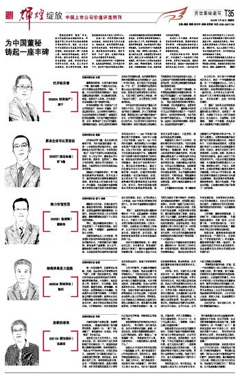 证券时报记者 水菁 戴着黑边眼镜,头发在脑后挽成一个髻,随手提着一个黑色的公文包,刘宁的着装总是显得简单、知性、干练。而在面对投资者和媒体时,她总是露出真诚的微笑,并以敏捷的思维,爽朗、洒脱的个人风格,往往是第一次见面就给人留下深刻的印象。 作为招商局旗下唯一的房地产上市公司招商地产(000024)的董秘,刘宁通过她的职业,以女性特有的亲和力,在企业和投资者之间搭建了一座畅通无阻的沟通桥梁。而在地产调控的特别时期,身为一家房地产上市公司的董秘,面临着新的挑战。如何让投资者理解和支持公司的重要决策,如何获取更多的资本市场资源为企业的发展助力?过去一年的时间里,刘宁说自己的状态就是一个字“忙”,因为需要付出更多的精力去应对来自稳定市值、危机公关处理、投资者关系管理等各方面的压力。可是习惯了这样的工作状态,停下来却不习惯了,反而更享受工作带来的快乐。 今年是刘宁担任招商地产董秘工作的第五个年头,在这几年时间里,招商地产经历了战略转型,步入了发展的新阶段,即便是在进入地产调控的房地产冬天,公司的年销售回款仍突破了200亿元的大关。而正因为刘宁以她的专业和敬业精神,孜孜不倦地努力推动着公司和投资者之间的良好沟通与互动,才让招商地产的发展路径获得市场越来越多的认同,并以更加清晰透明的形象呈现在投资者面前。 四年来,刘宁收获了无数荣誉,今年更是她连续第四次荣膺证券时报“主板公司百佳董秘”。对于这些荣誉,刘宁很珍惜,她说自己是真心热爱这份职业。“我认为她和我的性格非常契合,因为热爱,所以我愿意付出,也更享受工作带来的快乐。”“董秘最大的价值在于让公司和资本市场处于一个良性的循环中,充分利用资本市场,为公司发展不断寻求新的动力。一个优秀的董秘,应该对上述运作轻车熟路、收放自如。这也是我追求的境界”。 在工作之外,刘宁是个非常热爱生活的女人,她有一个幸福美满的家庭,有一个可爱懂事的女儿。而在工作之余,她也必须肩负起为人妻为人母的责任,但她同样很享受和家人在一起的时光。去年因为女儿要中考,她放弃了自己难得的度假休闲的机会。“忙并快乐着”,这是一种幸福的境界。 而“董秘”这份职业也带给很多人工作之外的快乐。刘宁说,现在,董秘的队伍不断壮大,也形成了一些圈子,大家除了在专业上进行交流和学习,还互相关心、互相帮助,非常温暖。“就像一个大家庭,这也是许多人不愿意离开的最主要原因吧。” |