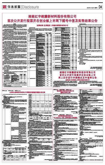 湖南红宇耐磨新材料股份有限公司首次公开发行股票并在创业板上市网下摇号中签及配售结果公告