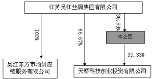 证券代码:000301 证券简称:东方市场 公告编号:2012-024 江苏吴江中国东方丝绸市场股份有限公司 关于参股子公司通过银行提供“仓单质押”定向委托贷款暨关联交易的公告 本公司及董事会全体成员保证信息披露内容的真实、准确和完整,没有虚假记载、误导性陈述或重大遗漏。 一、关联交易概述 1、江苏吴江中国东方丝绸市场股份有限公司(以下简称“公司”或“本公司”)的参股子公司天骄科技创业投资有限公司(以下简称“天骄科技”)决定通过中信银行盛泽支行,在总额度5,000万元内向吴江东方市场供应链服务有限公司(以下简称“供应链公司”)的“仓单质押”业务提供定向委托贷款。 本次定向委托贷款业务系指以本地中国东方丝绸市场为主的纺织商户(以下简称“借款人”),因资金周转所需,将其所有的纺织品及原料存入供应链公司指定的交收仓库,并以仓库出具的、在供应链公司注册的仓单项下商品向天骄科技进行质押,通过天骄科技、中信银行盛泽支行以委托贷款的形式定向取得融资的业务。借款人在取得贷款后向供应链公司预付动产质押综合服务费(以下简称“服务费”),该服务费包括:贷款利息、质押商品检测费、评估费、保管费、监管费、保险费等动产质押所需的全部费用。 贷款到期后,天骄科技作为委托贷款的资金提供方,收取按银行规定的委托贷款利息收益;丝绸集团收取服务费部分收益,并承担因借款人违约而按借款本息余额回购的责任,同时获得对质押货物进行处置的权利;供应链公司提供存货(仓单)质押监管服务、动产质押监管服务,收取服务费部分收益。 根据《吴江东方市场供应链服务有限公司仓单项下动产质押服务协议》约定的内容,董事会经审慎判断,认为:本项业务风险可控,同时又提高了参股子公司天骄科技资金的使用效率,并且符合公司的发展战略。 2、本公司持有天骄科技33.33%股权,江苏吴江丝绸集团有限公司(以下简称“丝绸集团”)持有天骄科技66.67%股权;丝绸集团持有本公司36.69%股权,为本公司控股股东;丝绸集团持有供应链公司100%股权。股权关系图如下: ■ 根据《深圳证券交易所股票上市规则》和《公司章程》的有关规定,本次天骄科技通过银行向供应链公司“仓单质押”业务提供定向委托贷款事项构成公司的关联交易。 3、2012年7月31日,公司第五届董事会第十九次会议以通讯表决方式召开,会议审议通过了《关于参股子公司通过银行提供“仓单质押”定向委托贷款的关联交易的议案》,关联董事计高雄先生、孙少华先生、姚京华先生回避本次表决,非关联董事一致通过该项议案。该议案已经全体独立董事事前认可并出具同意本次关联交易的独立意见。 4、根据《深圳证券交易所股票上市规则》及《公司章程》的有关规定,本次关联交易金额未超过3,000万元人民币,且未超过公司最近(2011年度)经审计净资产的5%,因此无需提交股东大会审议。 5、本次关联交易不构成《上市公司重大资产重组管理方法》规定的重大资产重组,不需要经过有关部门批准。 二、关联方介绍和关联方关系 (一)关联方基本情况 1、江苏吴江丝绸集团有限公司 公司住所:吴江市盛泽镇舜新路24号 法定代表人:黄志宏 注册资本:33,205万元人民币 公司类型:有限公司(国有独资) 注册号:320584000006750 经营范围:资产经营,生产销售:化纤织物,服装、纺织机械及器材、化工原料(化肥、农药、危险品除外);出口本企业自产的染色、印花绸缎、电脑绣花、服装;进口本企业生产、科研所需的原辅材料、机械设备、仪器仪表及零配件;经营本企业的进料加工和“三来一补”业务。 成立日期:1991年1月29日 截止2011年12月31日,丝绸集团的总资产为382,998.16万元,净资产为267,373.22万元,2011年度实现营业收入108,508.94万元,实现净利润11,093.17万元。 主要股东:吴江市国有(集体)资产管理委员会持有丝绸集团100%股权。 2、天骄科技创业投资有限公司 公司住所:江苏省吴江市盛泽镇市场路南侧 法定代表人:孙怡虹 公司注册资本:9,000万元人民币 公司类型:有限公司 注册号:320584000005595 经营范围:许可经营项目:无。一般经营项目:创业投资、符合国家产业政策的项目投资,高新技术企业的直接投资,创业投资管理公司的发起与管理,创业投资咨询;为创业企业提供创业管理服务;参与设立创业投资企业与创业投资管理顾问机构。 成立日期:2001年5月31日 截止2011年12月31日,天骄科技的总资产为?9,403.80万元,净资产为7,615.08万元,2011年度实现营业收入108.84万元,实现净利润137.54万元。 主要股东:本公司持有天骄科技33.33%股权,丝绸集团持有天骄科技66.67%股权。 3、吴江东方市场供应链服务有限公司 公司住所:吴江市盛泽镇市场路南侧 法定代表人:祝继文 注册资本:600万元人民币 公司类型:有限公司(法人独资)内资 注册号:320584000299802 主营业务:许可经营项目:无。一般经营项目:企业供应链管理和供应链外包服务,投资管理及咨询服务,自有房产、机器设备租赁服务;纺织原料及产品的电子商务信息咨询服务、物流信息咨询服务、外包服务咨询、国际货运咨询服务;针纺织品、化纤原料、棉纱、服装销售;受托从事存货(仓单)质押监管服务、动产质押监管服务;自营和代理各类商品及技术的进出口业务(国家限定企业经营或禁止进出口的商品和技术除外);软件研发、生产、销售;电子产