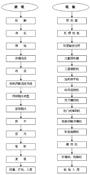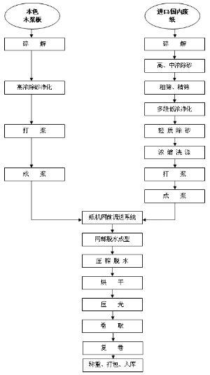 (二)主要产品的生产工艺流程 1、主要产品生产工艺的特点 公司生产工艺的特点是以废纸为主要原材料,不自制化学浆,采用物理造纸工艺,生产“绿色包装”产品,对环境保护具有重要意义。 (1)综合利用废纸,循环利用资源 公司主要生产原材料的95%以上为废纸,利用废纸造纸,一方面节约大量木材和能源,降低生产成本,取得良好的经济效益;另一方面通过废弃物再生利用,化害为利,使包装废弃物资源化、减量化和无害化,属循环经济范畴,有利于实现经济的可持续发展。 (2)生产过程采用物理造纸工艺,发展生态纸业 公司以废纸和商品木浆为主要生产原料,经过碎解、净化、筛选、打浆等工序制成浆料送纸机抄造,避开了造纸行业污染最为严重的化学制浆环节和漂白环节,不存在蒸煮过程产生的黑液污染问题和漂白污染问题,具有清洁生产和生态纸业的特点。 2、主要产品生产工艺流程 (1)箱板纸 ■ (2)瓦楞原纸 (3)瓦楞箱板纸箱 (4)新闻纸、文化纸 ■■ (三)发行人的经营模式 发行人始终坚持走循环经济道路,以废纸为主要原材料开展生产经营,以包装纸板产品为主,发展规模经济,并向纸箱等下游产业延伸,实现互动式发展。 ■ 1、采购模式 公司下设原料采购部和辅料采购部,原、辅料实行“统一审批、集中采购”的模式。 公司与进口废纸及木浆供应商签署框架性合同,对产品种类、交货方式、付款方式及争议解决方式进行原则性约定,然后根据公司生产计划按产品分年度、季度或月度以订单方式向供应商发出采购计划,完成采购任务。 国内废纸主要由公司控股子公司蓝天公司面向江苏、浙江、安徽、上海、湖北等省市废品回收站、个体户进行收购,多年来已形成较为稳定的回收网络。 2、生产模式 公司生产部根据市场营销部提供的销售信息制定年度、月度生产计划,并以生产任务单的形式下达,由生产车间执行。生产部全程跟踪生产计划的执行情况。 通过有效的生产计划、物料安排、现场管理和物流控制,公司能够满足销售合同所规定的供货义务。 3、销售模式 公司所有产品均由公司直接销售,公司设有市场营销部负责产品销售,建立了以资金管理为重点、责权利相结合的销售责任制,采取“质量以优取胜,价格以廉取胜,品种以全取胜,服务以好取胜”的营销策略,逐步扩大销售网络。产品价格根据成本和市场同类产品售价确定,保持一定的价格竞争优势。 (四)发行人主要产品的产销情况 1、公司近三年主要产品产销量情况
