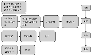 公司通过加强品牌建设及提高企业形象,扩大了在国内外市场的影响力,拥有一套成熟的市场开拓机制。业务部通过多种渠道接触下游客户,以对动漫服饰发展的深刻理解为基础,以为客户提供个性化服务为前提,以对市场的快速反映为理念,紧紧把握国际市场的发展。其销售流程图示如下: