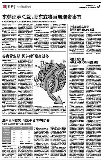 东莞证券总裁:股东或将重启增资事宜东莞证券急需补充资本,股东增资意愿强烈,但就各自增资比例未达成一致意见 2012-09-12 来源:证券时报网 作者:伍泽琳
