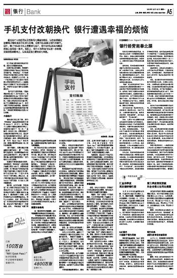 手机支付改朝换代 银行遭遇幸福的烦恼 2012-10-15 来源:证券时报网 作者:罗克关