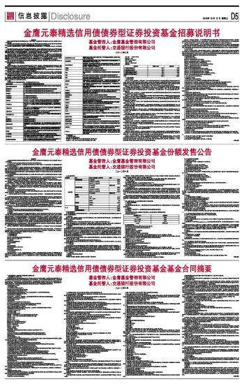 基金管理人:金鹰基金管理有限公司 基金托管人:交通银行股份有限公司 二O一二年十月 【重要提示】 金鹰元泰精选信用债债券型证券投资基金(以下简称“本基金”)的募集已获中国证监会2012年9月3日证监许可【2012】1174号文核准。 基金管理人保证本招募说明书的内容真实、准确、完整。本招募说明书经中国证监会核准,但中国证监会对本基金募集的核准,并不表明其对本基金的价值和收益做出实质性判断或保证,也不表明投资于本基金没有风险。 基金管理人承诺依照恪尽职守、诚实信用、谨慎勤勉的原则管理和运用基金财产,但不保证基金一定盈利,也不保证最低收益。 本基金投资于证券市场,基金净值会因为证券市场波动等因素产生波动,投资者在投资本基金前,应全面了解本基金的产品特性,充分考虑自身的风险承受能力,理性判断市场,并承担基金投资中出现的各类风险,包括:因政治、经济、社会等环境因素对证券价格产生影响而形成的系统性风险、个别证券特有的非系统性风险、由于基金投资人连续大量赎回基金产生的流动性风险、基金管理人在基金管理实施过程中产生的基金管理风险、本基金的特定风险等等。 本基金为债券型基金,其长期平均风险和预期收益率低于股票基金、混合基金,高于货币市场基金。本基金需承担债券市场的系统性风险,以及因个别债券违约所形成的信用风险,因本基金的固定收益类资产主要投资于信用债券,因此信用债券市场的波动对基金份额净值影响较大;同时本基金资产将有一定比例投资于中小企业私募债券,受其具低流动性和较高信用风险的影响,相较于不投资中小企业私募债券的信用债基金,本基金总体风险更高。本基金基金份额分为 A、C 类,A 类基金份额收取认(申)购费;C 类基金份额不收取认(申)购费,但计提销售服务费;A、C 类基金份额适用不同的赎回费率。 投资人认购本基金时应认真阅读本基金的招募说明书和基金合同。基金管理人建议投资人根据自身的风险收益偏好,选择适合自己的基金产品,并且中长期持有。 基金的过往业绩并不预示其未来表现。 一、绪言 本招募说明书依据《中华人民共和国证券投资基金法》(以下简称《基金法》)、《证券投资基金运作管理办法》(以下简称《运作办法》)、《证券投资基金销售管理办法》(以下简称《销售办法》)、《证券投资基金信息披露管理办法》(以下简称《信息披露办法》)及其他有关规定以及《金鹰元泰精选信用债债券型证券投资基金基金合同》编写。 本招募说明书阐述了金鹰元泰精选信用债债券型证券投资基金的投资目标、策略、风险、费率等与投资人投资决策有关的全部必要事项,投资人在做出投资决策前应仔细阅读本招募说明书。 基金管理人承诺本招募说明书不存在任何虚假记载、误导性陈述或者重大遗漏,并对其真实性、准确性、完整性承担法律责任。本基金是根据本招募说明书所载明的资料申请募集的。本基金管理人没有委托或授权任何其他人提供未在本招募说明书中载明的信息,或对本招募说明书作任何解释或者说明。 本招募说明书根据本基金的基金合同编写,并经中国证监会核准。基金合同是约定基金当事人之间权利、义务的法律文件。基金投资人自依基金合同取得基金份额,即成为基金份额持有人和本基金合同的当事人,其持有基金份额的行为本身即表明其对基金合同的承认和接受,并按照《基金法》、基金合同及其他有关规定享有权利、承担义务。基金投资人欲了解基金份额持有人的权利和义务,应详细查阅基金合同。 二、释义 在本招募说明书中,除非文意另有所指,下列词语或简称具有如下含义: