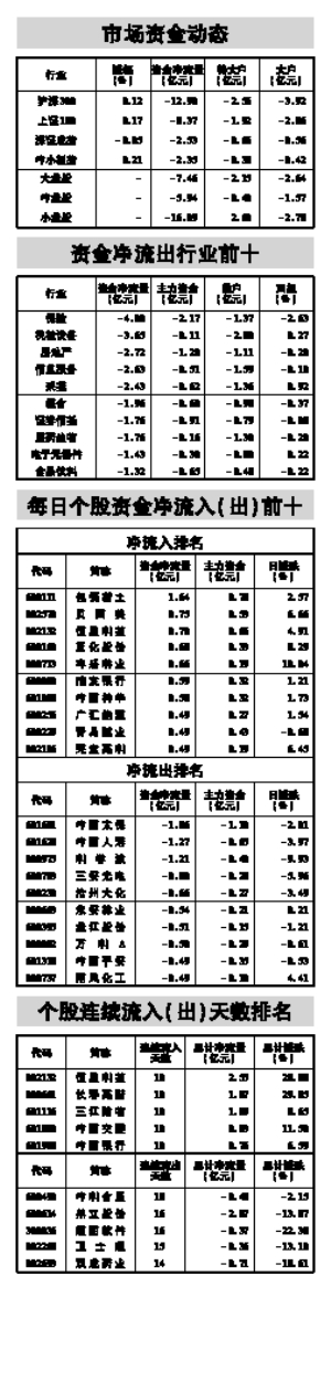 据STCN资金流向快报(http://data.stcn.com/statisticalData.shtml)数据显示,10月17日,沪深两市共流出资金29.49亿元,连续第5个交易日净流出。其中,沪市净流出15.03亿元,深市净流出14.46亿元。主力资金合计流出6.95亿元。 指数方面,上证180指数成份股合计资金流出8.37亿元,深证成指成份股资金流出2.53亿元,沪深300指数成份股资金流出12.90亿元。以股本规模计,流通盘中大盘股资金流出7.46亿元,中盘股资金流出5.94亿元,小盘股资金流出16.09亿元。 行业方面,按照衍生申万一级行业分类计,有2个行业资金净流入,23个行业资金净流出。其中,银行流入资金1.72亿,成为资金最关注的行业;保险流出资金4.00亿,有较明显的资金出逃现象。 银行业已持续2个交易日净流入资金,共流入资金5.19亿,居行业连续流入天数榜首位。建筑建材业已持续6个交易日净流出资金,共流出资金20.40亿,为行业连续流出天数榜第一。 恒星科技已持续10个交易日净流入资金,累计流入资金2.55亿,居个股连续流入天数榜首位。中科合臣已持续18个交易日净流出资金,累计流出资金0.48亿,为个股连续流出天数榜第一。 股指期货方面,IF1210合约收报2309.40点,微涨0.40%;成交47.84万手,持仓量减15529手,收报3.04万手;资金共流入24.25亿。(黄舒欣) (本栏目数据来源:名策数据) 本版导读: