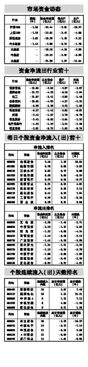 据STCN资金流向快报(http://data.stcn.com/statisticalData.shtml)数据显示,10月23日,沪深两市共流出资金93.30亿元,连续第3个交易日净流出。其中,沪市净流出37.32亿元,深市净流出55.98亿元。主力资金合计流出28.86亿元。 指数方面,上证180指数成份股合计资金流出15.61亿元,深证成指成份股资金流出10.50亿元,沪深300指数成份股资金流出33.44亿元。以股本规模计,流通盘中大盘股资金流出18.10亿元,中盘股资金流出23.25亿元,小盘股资金流出51.96亿元。 行业方面,按照衍生申万一级行业分类计,有2个行业资金净流入,23个行业资金净流出。其中,黑色金属流入资金3.13亿,成为资金最关注的行业;证券信托流出资金12.82亿,有较明显的资金出逃现象。 银行业已持续2个交易日净流入资金,共流入资金4.35亿,居行业连续流入天数榜首位。医药生物业已持续3个交易日净流出资金,共流出资金18.54亿,为行业连续流出天数榜第一。 福建南纺已持续10个交易日净流入资金,累计流入资金2.67亿,居个股连续流入天数榜首位。鼎立股份已持续20个交易日净流出资金,累计流出资金2.59亿,为个股连续流出天数榜第一。 股指期货方面,IF1211合约收报2324.40点,下跌1.31%;成交45.13万手,持仓量增221手,收报7.13万手;资金共流出60.44亿。(黄舒欣) (本栏目数据来源:名策数据) 本版导读: