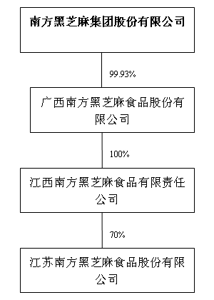 证券代码:000716 证券简称: 南方食品 公告编号:2012-061 南方黑芝麻集团股份有限公司 关于调整下属公司股权结构的公告 本公司及监事会全体成员保证信息披露内容的真实、准确、完整,没有虚假记载、误导性陈述或者重大遗漏。 南方黑芝麻集团股份有限公司(以下简称“公司、上市公司”)第七届董事会2012年第五次临时会议于2012年10月24日以通讯方式召开,会议以通讯方式进行表决,以9票同意,0票反对,0票弃权,全票通过了《关于调整下属公司股权结构的议案》,董事会同意对下属公司的股权结构进行调整,由上市公司收购下属孙公司江西南方黑芝麻食品有限责任公司(以下简称“江西南方公司”)持有江苏南方黑芝麻食品股份有限公司(以下简称“江苏南方公司”)70%股权。现将有关情况公告如下: 一、调整下属公司股权结构的背景与目的 随着公司黑芝麻战略的深入实施,公司对黑芝麻产业相关资源和业务进行了有效整合,为公司的快速、持续发展奠定了良好基础,由此上市公司的下属公司逐渐增多,管理链条也不断拉长,为此,根据公司经营发展和市场竞争的需要,为进一步强化本公司对下属公司的管控,缩短本公司对下属公司的管理链条,提高管理效率,有必要优化调整部分下属公司的股权结构。 二、下属公司股权结构调整的方式 本次内部股权结构调整的标的为江西南方公司持有江苏南方公司70%的股权。江苏南方公司是一家以经营豆浆等大豆制品为主营业务的食品生产经营企业,其注册资本为1000万元人民币,其中江西南方公司出资700万元,自然人陈新华出资250万元,自然人何捷出资50万元。 上市公司以700万元收购其孙公司江西南方公司持有的江苏南方公司的70%股权,收购完成后,江苏南方公司成为上市公司直接控股的子公司,而江西南方公司不再持有江苏南方公司任何的股权。 江苏南方公司的其他股东承诺放弃上述转让股权的优先受让权。 三、股权结构调整前后本公司对江苏南方公司的控制关系 1、股权结构调整前 ■ 2、股权结构调整后 ■ 四、股权调整后对上市公司的影响 1、在本次股权调整前,江苏南方公司已纳入本公司财务报表的合并范围,且本次股权收购为内部股权结构的调整,因此本次股权收购不会对本公司的财务报表造成任何的影响。 2、收购完成后,上市公司将直接管控江苏南方公司,有利于公司缩短管理链条,提高公司对下属控股公司的控制能力,提高管理效率。 特此公告 南方黑芝麻集团股份有限公司 董 事 会 二○一二年十月二十五日 本版导读: