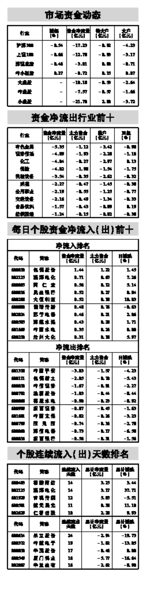 据STCN资金流向快报(http://data.stcn.com/statisticalData.shtml)数据显示,10月29日,沪深两市共流出资金39.45亿元,连续第7个交易日净流出。其中,沪市净流出24.48亿元,深市净流出14.97亿元。主力资金合计流出6.31亿元。 指数方面,上证180指数成份股合计资金流出12.78亿元,深证成指成份股资金流出3.01亿元,沪深300指数成份股资金流出17.23亿元。以股本规模计,流通盘中大盘股资金流出10.18亿元,中盘股资金流出7.57亿元,小盘股资金流出21.70亿元。 行业方面,按照衍生申万一级行业分类计,有4个行业资金净流入,21个行业资金净流出。其中,医药生物流入资金0.88亿,成为资金最关注的行业;有色金属流出资金5.35亿,有较明显的资金出逃现象。 有色金属业已持续7个交易日净流出资金,共流出资金52.96亿,为行业连续流出天数榜第一。 福建南纺已持续14个交易日净流入资金,累计流入资金3.25亿,居个股连续流入天数榜首位。鼎立股份已持续24个交易日净流出资金,累计流出资金2.94亿,为个股连续流出天数榜第一。 股指期货方面,IF1211合约收报2244.00点,下跌0.54%;成交33.58万手,持仓量减1615手,收报7.03万手;资金共流入0.41亿。(黄舒欣) (本栏目数据来源:名策数据) 本版导读:
