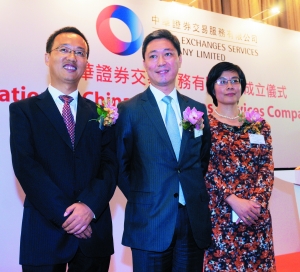 由沪深港三大证券交易所成立的合资公司——中华证券交易服务有限公司30日正式开业。中华交易服务总裁陈秉强(中)说,中华交易服务将透过发展一系列跨境指数及相关金融产品,致力为推动中国资本市场进一步国际化作出贡献。图为三方代表出席开业仪式。 徐欢/摄 (更多报道见A4版)