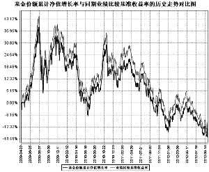 2、基金合同生效以来基金份额净值的变动情况,并与同期业绩比较基准的变动进行比较: ■ 基金管理人承诺以诚实信用、勤勉尽责的原则管理和运用基金财产,但不保证基金一定盈利。基金的过往业绩并不代表其未来表现。投资有风险,投资人在做出投资决策前应仔细阅读本基金招募说明书。 注1:业绩基准=沪深300指数收益率×95%+银行同业存款利率×5%。 注2:本基金基金合同于2009年4月3日生效。 注3:基金业绩截止日为2012年9月30日(未经审计)。 十三、基金的费用与税收 (一)基金费用的种类 1、基金管理人的管理费; 2、基金托管人的托管费; 3、《基金合同》生效后与基金相关的信息披露费用; 4、《基金合同》生效后与基金相关的会计师费、律师费和诉讼费; 5、基金份额持有人大会费用; 6、基金的证券交易费用; 7、基金的银行汇划费用; 8、按照国家有关规定和《基金合同》约定,可以在基金财产中列支的其他费用。 本基金终止清算时所发生费用,按实际支出额从基金财产总值中扣除。 (二)基金费用计提方法、计提标准和支付方式 1、基金管理人的管理费 本基金的管理费按前一日基金资产净值的0.75%年费率计提。管理费的计算方法如下: H=E×0.75%÷当年天数 H为每日应计提的基金管理费 E为前一日的基金资产净值 基金管理费每日计算,逐日累计至每月月末,按月支付,由基金管理人向基金托管人发送基金管理费划款指令,基金托管人复核后于次月前2个工作日内从基金财产中一次性支付给基金管理人。若遇法定节假日、公休假等,支付日期顺延。 2、基金托管人的托管费 本基金的托管费按前一日基金资产净值的0.15%的年费率计提。托管费的计算方法如下: H=E×0.15%÷当年天数 H为每日应计提的基金托管费 E为前一日的基金资产净值 基金托管费每日计算,逐日累计至每月月末,按月支付,由基金管理人向基金托管人发送基金托管费划款指令,基金托管人复核后于次月前2个工作日内从基金财产中一次性支取。若遇法定节假日、公休日等,支付日期顺延。 上述一、基金费用的种类中第3-7项费用,根据有关法规及相应协议规定,按费用实际支出金额列入当期费用,由基金托管人从基金财产中支付。 (三)与基金销售有关的费用 1、申购费 本基金的申购费用应在投资人申购基金份额时收取。本基金的申购费用不列入基金财产,主要用于本基金的市场推广、销售、注册登记等各项费用。 本基金采取金额申购的方式,场外、场内的申购费率相同,具体费率如下: