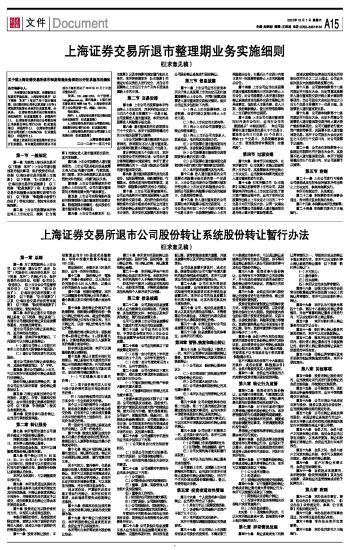 第一节 一般规定 第一条 为规范上海证券交易所(以下简称“本所”)上市公司退市整理期的相关事项,保护投资者权益,根据《上海证券交易所股票上市规则》(以下简称“《上市规则》”)、《上海证券交易所交易规则》(以下简称“《交易规则》”)和《上海证券交易所风险警示板股票交易暂行办法》(以下简称“《风险警示板暂行办法》”)等有关规定,制定本业务实施细则。 第二条 上市公司股票被本所作出终止上市决定后,按照《上市规则》的规定进入退市整理期交易的,适用本细则。 第三条 上市公司股票进入退市整理期的,上市公司及其相关信息披露义务人仍应当遵守法律、行政法规、部门规章、本所业务规则以及其他规范性文件的规定,并履行相关义务。 第四条 上市公司股票被本所作出终止上市决定的,公司在退市整理期间不得筹划重大资产重组事宜。 第五条 上市公司有限售条件股份的限售期限在退市整理期间连续计算。限售期限未届满的,相关股份在退市整理期内不得流通。 第六条 上市公司未按本所《上市规则》以及本细则的规定履行相关义务的,本所将依据本所《上市规则》的规定对有关责任人进行处分,并自公司股票终止上市后三十六个月内不受理其重新上市的申请。 第二节 交易安排 第七条 上市公司的股票被本所作出终止上市决定的,自本所作出决定之日后五个交易日届满的下一交易日起,公司股票进入退市整理期,本所安排其股票进入风险警示板交易。 第八条 退市整理期的交易期限为三十个交易日。本所于该期限届满后的次日对相关股票予以摘牌。 上市公司股票在退市整理期内全天停牌的,停牌期间不计入退市整理期。全天停牌天数累计不得超过五个交易日。 累计停牌达到五个交易日后,本所不再接受公司的停牌申请;公司未在累计停牌期满前申请复牌的,本所于累计停牌期满后的下一交易日恢复公司股票的退市整理期交易。 第九条 退市整理期股票的其他交易安排,包括股票简称、涨跌幅限制、行情显示、投资者适当性管理等事项,适用本所《风险警示板暂行办法》的规定。 第十条 上市公司股票被摘牌后,公司应当选择并申请将其股票转入全国性的场外交易市场、其他符合条件的区域性场外交易市场或者本所设立的退市公司股份转让系统进行股份转让;公司不申请的,本所安排其股票在本所退市公司股份转让系统进行股份转让。 第三节 信息披露 第十一条 上市公司应当在收到本所关于终止其股票上市的决定后及时披露股票终止上市公告,并同时披露其股票进入退市整理期交易相关情况。相关公告应至少包括如下内容: (一)终止上市的股票种类、证券简称、证券代码以及预计终止上市的日期; (二)终止上市决定的主要内容; (三)终止上市后公司股票登记、转让和管理事宜; (四)终止上市后公司的联系人、联系地址、电话和其他通讯方式; (五)公司股票在退市整理期间的证券代码、证券简称及涨跌幅限制; (六)公司股票退市整理期交易期限及预计最后交易日期; (七)公司股票在退市整理期交易期间将不进行重大资产重组事宜的说明; (八)本所要求披露的其他内容。 第十二条 进入退市整理期的公司股票在风险警示板交易的第一个交易日,上市公司应当发布公司股票已被本所作出终止上市决定的风险提示公告,说明公司股票在风险警示板交易的起始日、交易期限等事项。 第十三条 进入退市整理期的公司股票在本所风险警示板的交易期间,上市公司应当在前二十五个交易日内每五个交易日发布一次股票将被终止上市的风险提示公告,在最后五个交易日内每日发布一次股票将被终止上市的风险提示公告。 第十四条 上市公司应当在其股票的退市整理期届满当日再次发布终止上市公告,对公司股票进入本所退市股份转让系统或者其他场外交易市场转让的具体事宜,包括进入市场名称、进入日期、股份重新确认、登记托管等股票终止上市后续安排作出说明。 第十五条 上市公司在退市整理期间对外发布公告时,应当在公告的“重要提示”中特别说明:“本公司股票将在退市整理期交易三十个交易日,截至本公告日已交易YY个交易日,剩余YY个交易日,交易期满将被终止上市,敬请投资者审慎投资、注意风险”。 第四节 过渡安排 第十六条 除本节另有规定外,在本所修订的《上市规则》实施以前被暂停上市的公司,其股票被本所作出终止上市决定后,应当按照本细则的规定进入退市整理期进行交易。 第十七条 在本所修订的《上市规则》实施以前被暂停上市的公司,其股票被本所作出终止上市决定后仍处于重大资产重组过程中的,应当于本所对其股票作出终止上市决定之日后的二十个交易日内召开股东大会,以同一议案决定是否同意公司股票进入退市整理期交易并终止重大资产重组等事项。 前述议案须经出席会议的股东所持表决权的三分之二以上通过。公司应为该次股东大会提供网络投票方式。 第十八条 公司按本细则第十七条的规定召开股东大会,决定同意其股票进入退市整理期交易并终止重大重组等事项的,自公司股东大会决议作出之日后五个交易日届满的下一交易日起,其股票进入退市整理期交易。 第十九条 公司按本细则第十七条的规定召开股东大会,决定不同意公司股票进入退市整理期交易并终止重大资产重组