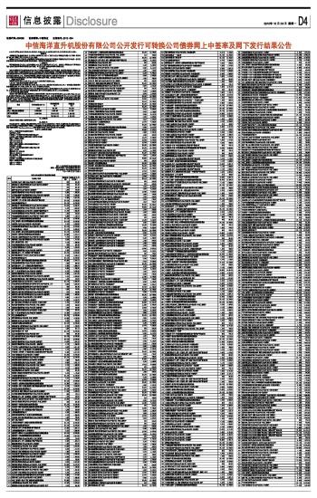 根据2012年12月17日公布的《中信海洋直升机股份有限公司公开发行可转换公司债券发行公告》,本公告一经刊出即被视为向所有参加申购的投资者送达获配信息。现将发行申购结果公告如下: